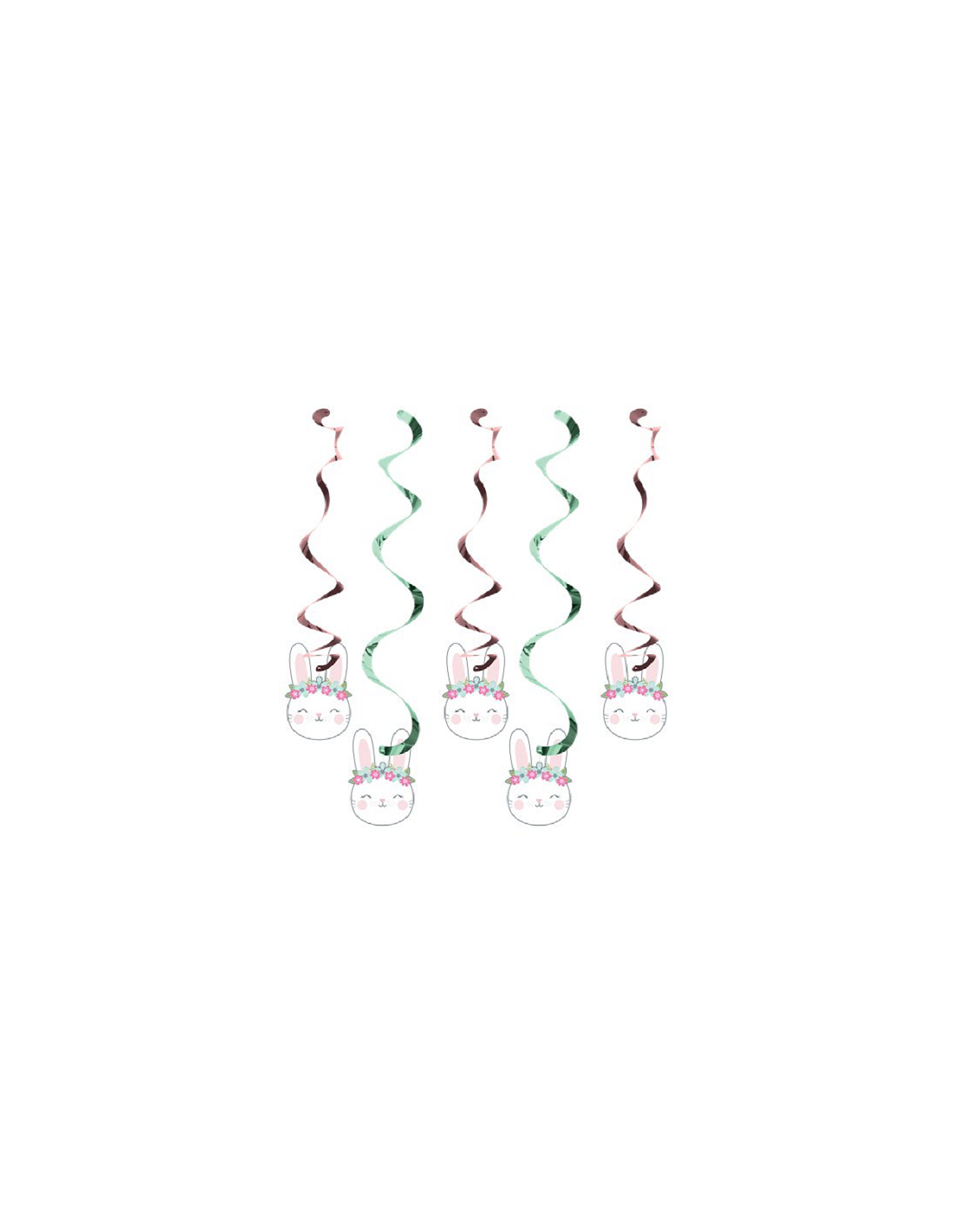 Diese Pappdekorationen zeigen an jedem Spiralenende einen lächelnden Hasenkopf mit Blumenkranz und großen Ohren. Sie eignen sich perfekt für die Dekoration des ersten Geburtstags oder der Babyparty Ihres Kindes.