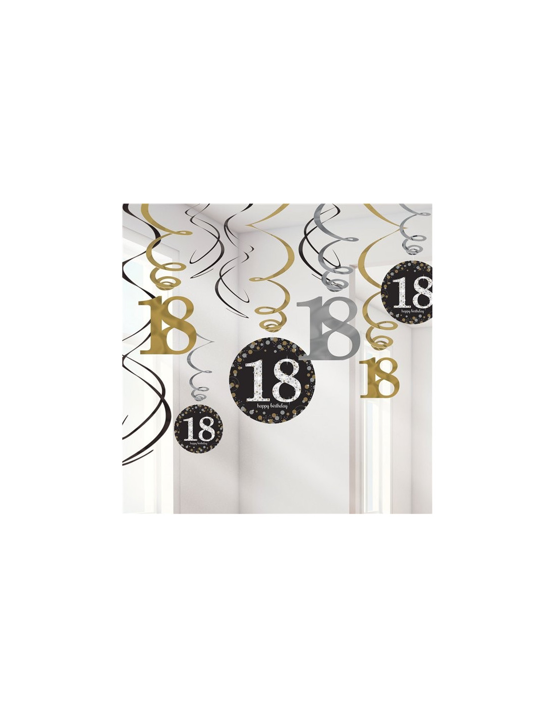 Feiere deinen 18. Geburtstag mit dieser glamourösen „Happy Birthday“-Dekoration . Die hübschen, hängenden Girlanden in Schwarz, Silber und Gold verleihen deiner Geburtstagsparty einen Hauch von Glanz. Hänge sie an die Decke und schaffe so die perfekte Atmosphäre für deine Feier.