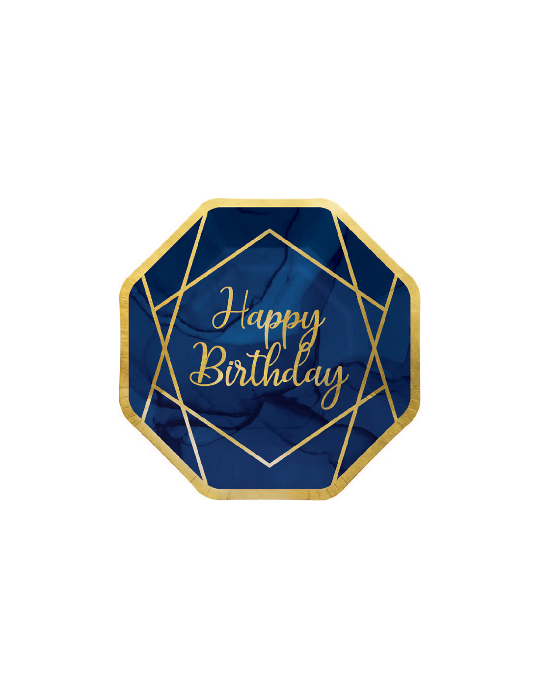Diese wunderschönen achteckigen Pappteller im Stil der 1920er-Jahre bestechen durch marineblaue Farbverläufe in Aquarelloptik. Sie sind mit dem glänzenden Schriftzug „Happy Birthday“ und leuchtend goldenen geometrischen Linien verziert. Der Rand jedes Tellers ist mit einem goldenen Band eingefasst.