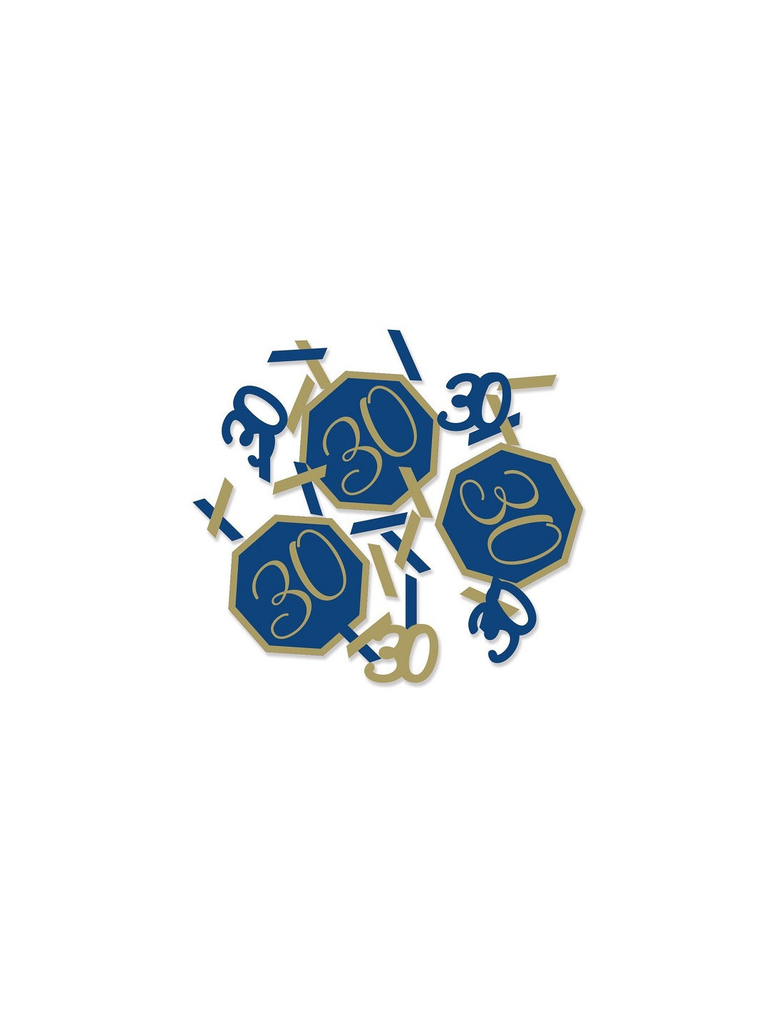Verzieren Sie Ihre Geburtstagstafel mit diesem glänzenden Konfetti mit der Aufschrift „30 Jahre“ . Die Packung enthält zehn Papiersechsecke, die beidseitig mit der glänzenden goldenen Zahl „30“ auf marineblauem Hintergrund bedruckt sind. Kleine Dreiecke und Stäbchen aus glänzender goldener und marineblauer Metallicfolie sind ebenfalls enthalten.