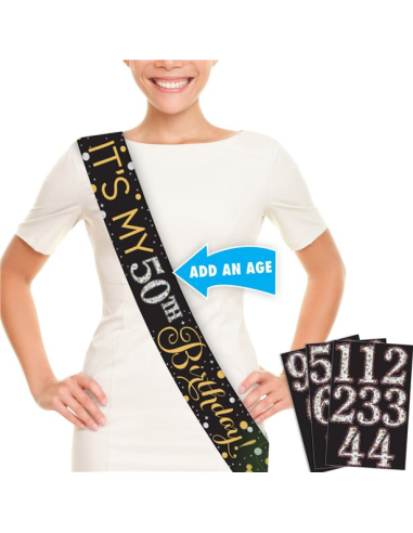 Diese Geburtstagsschärpe hat ein metallisches Schwarz-Silber-Finish und trägt die Aufschrift „It's My Birthday“. Mit den mitgelieferten Aufklebern können Sie in der Mitte Ihr Alter hinzufügen, um der Schärpe einen persönlichen Look zu verleihen.