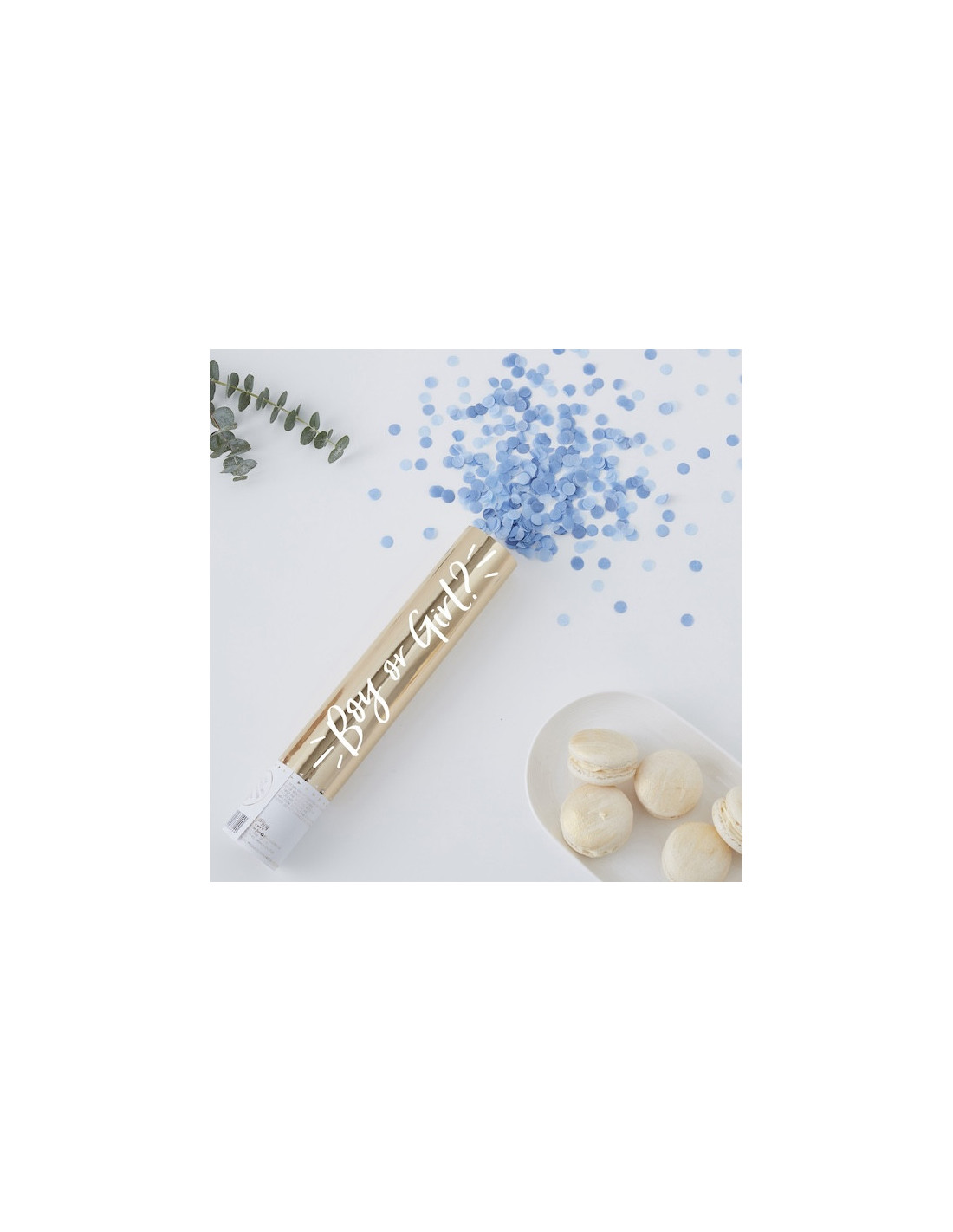 Die geschlechtsneutrale Goldverpackung hält das Geheimnis bis zum Moment der Enthüllung wach: Eine prächtige Explosion blauen Konfettis bricht aus der Kanone hervor und symbolisiert die Ankunft eines kleinen Jungen.