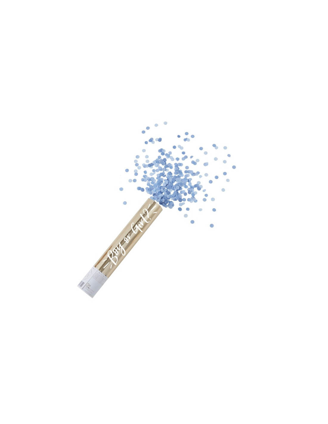 Auf der Konfettikanone befindet sich ein blauer Aufkleber, der darauf hinweist, dass sie blaues Konfetti enthält. Denken Sie aber daran, diesen vor der Ankunft Ihrer Gäste zu entfernen, um die Überraschung zu bewahren!