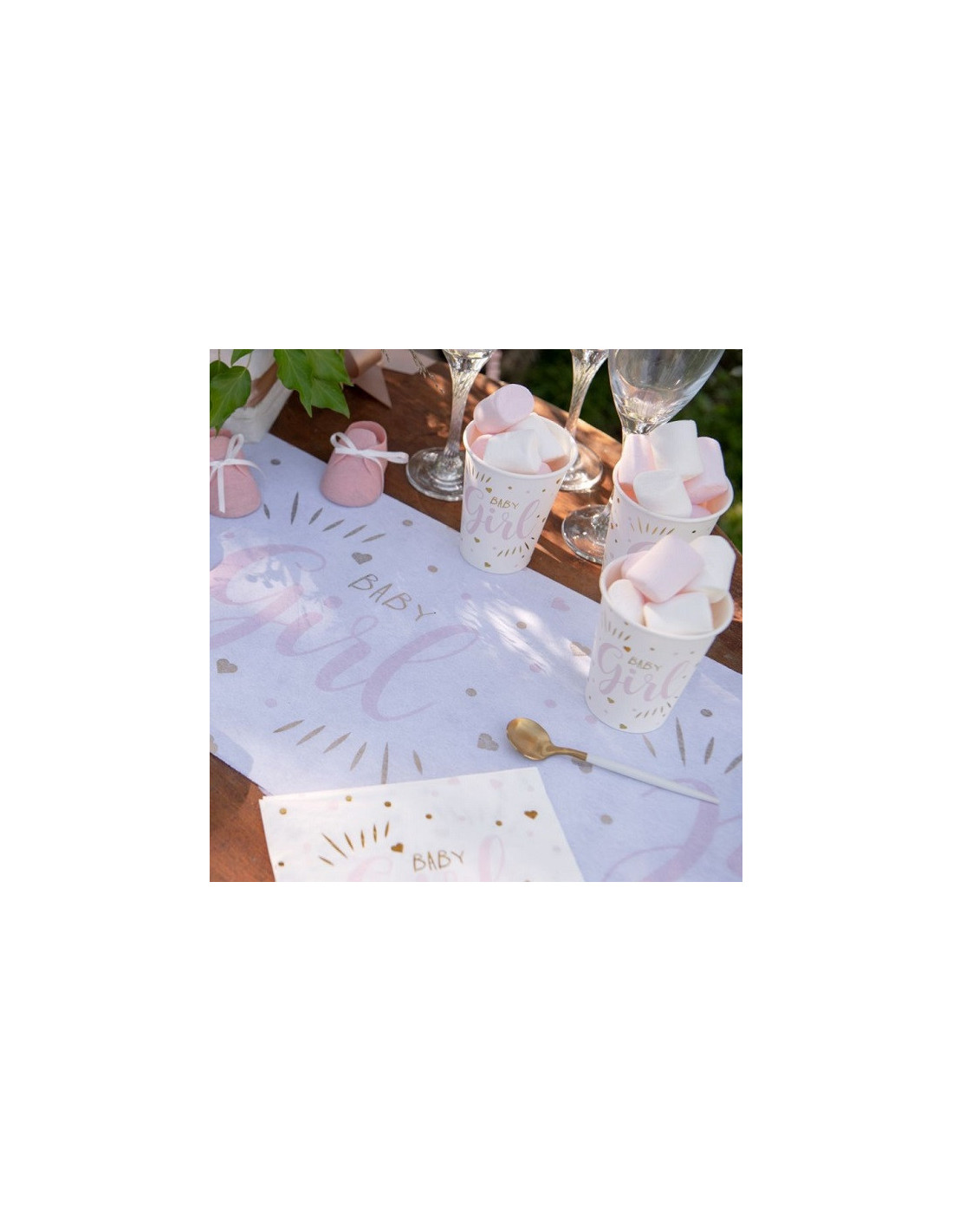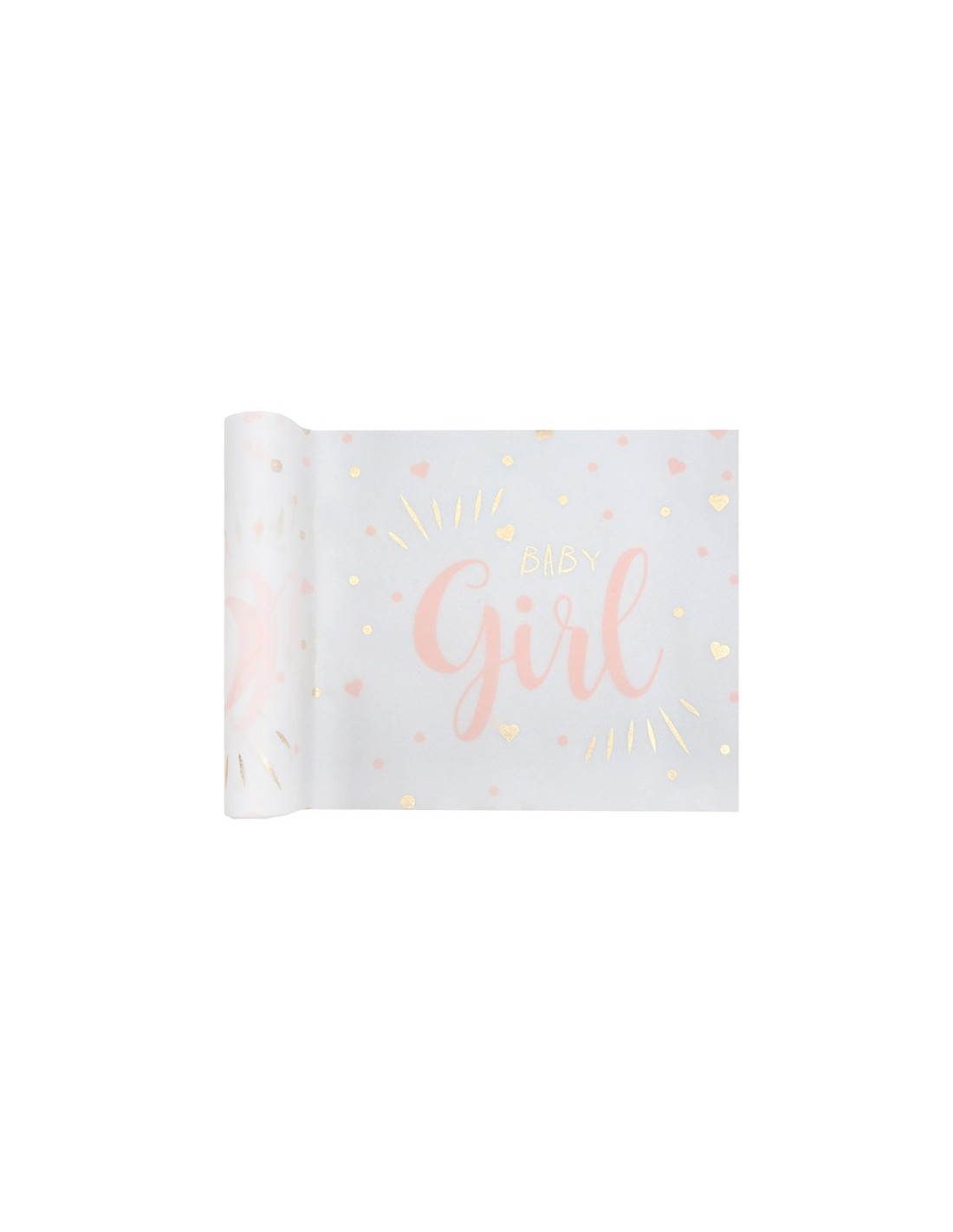 Dieser hübsche Tischläufer eignet sich perfekt, um den Tisch bei einer Babyparty oder Taufe festlich zu dekorieren. Er ist weiß mit den Aufschriften „Baby“ in Gold und „Girl“ in Rosa sowie vielen kleinen Herzen und verschiedenen anderen Motiven.