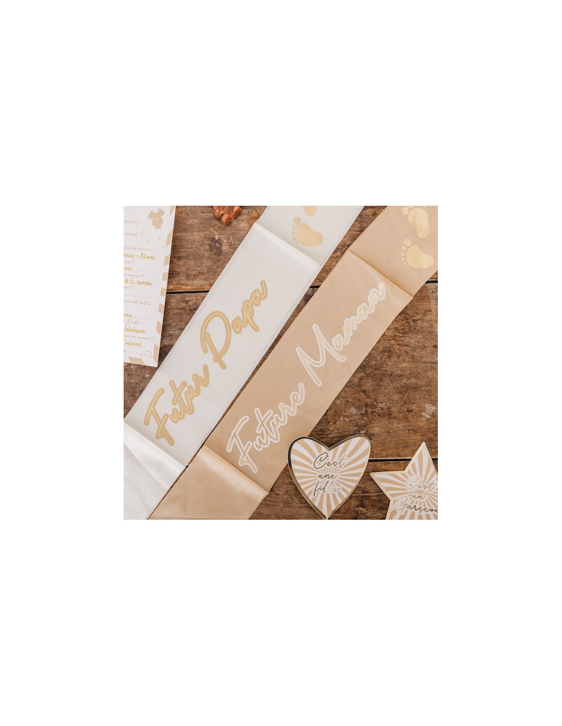 Feiern Sie die Babyparty Ihres Kindes mit Eleganz und Herzlichkeit. Ist das Zusammensein mit der Familie nicht einer der schönsten Momente? Und wenn Sie mit dieser nudefarbenen und goldenen Schärpe „Zukünftiger Papa“ im Mittelpunkt stehen, wird die Feier noch schöner!