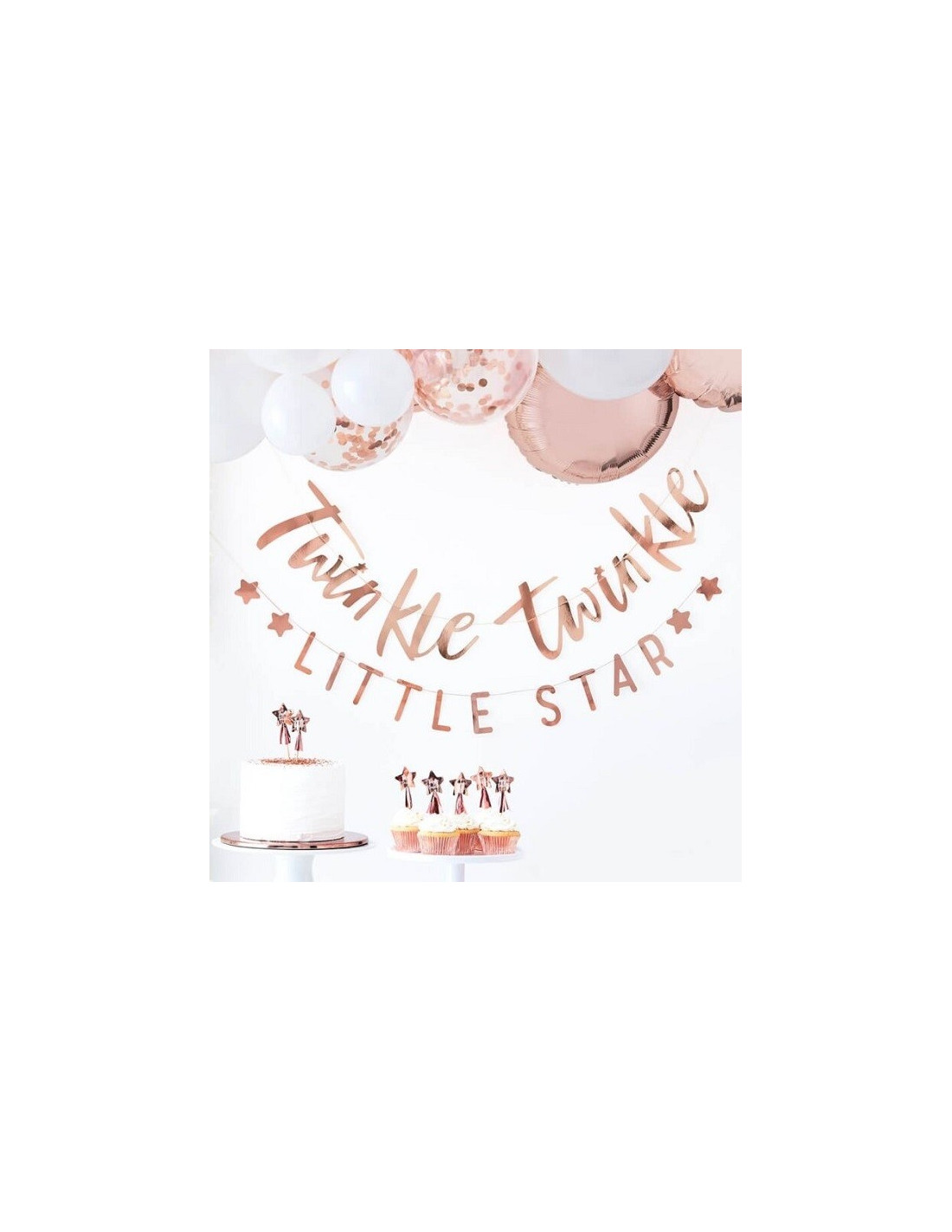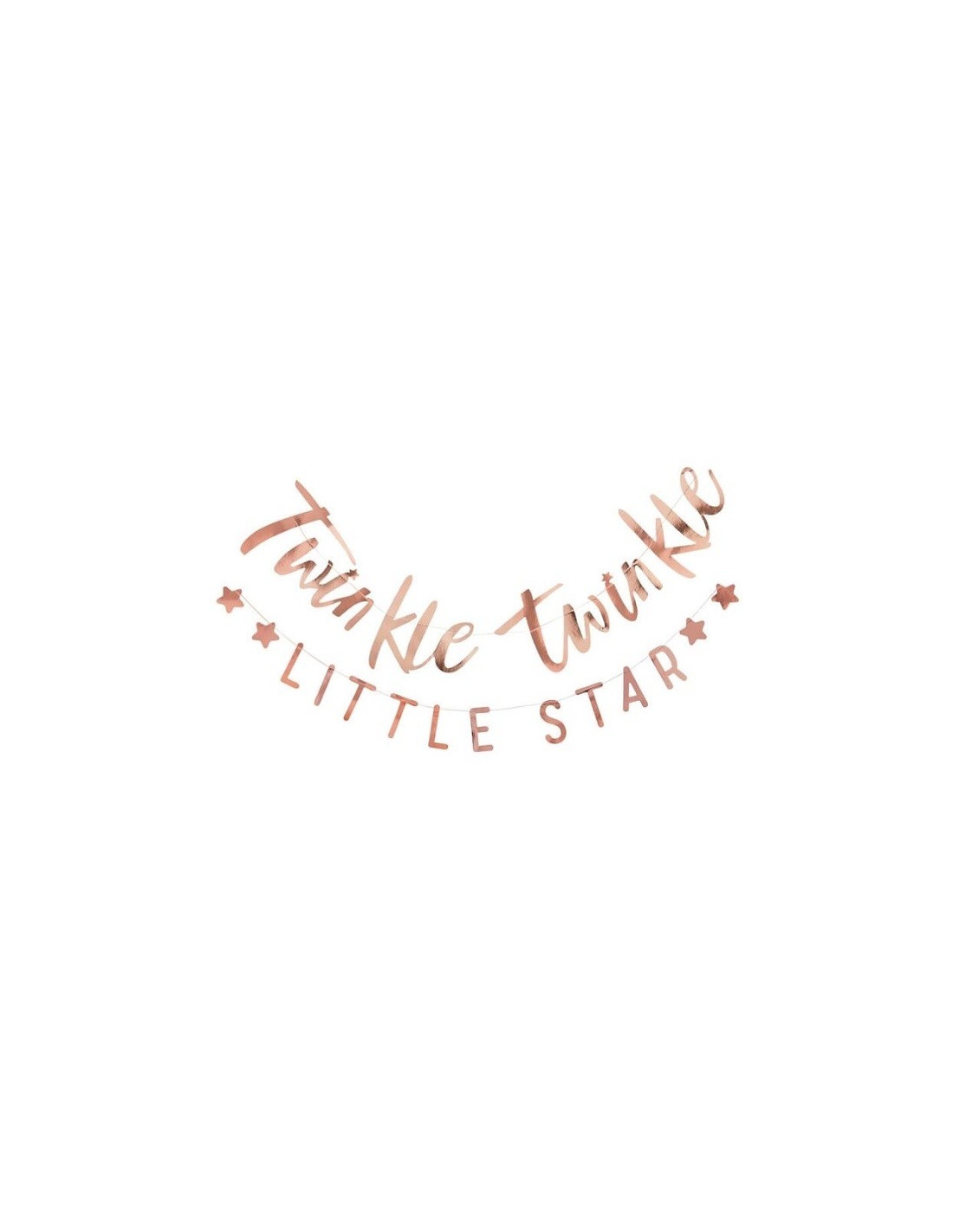 Verschönern Sie Ihr Zimmer mit unseren hübschen Girlanden aus roségoldener Folie mit dem Aufdruck „Funkel, funkel, kleiner Stern“. Sie eignen sich perfekt für die Dekoration Ihrer Babyparty.