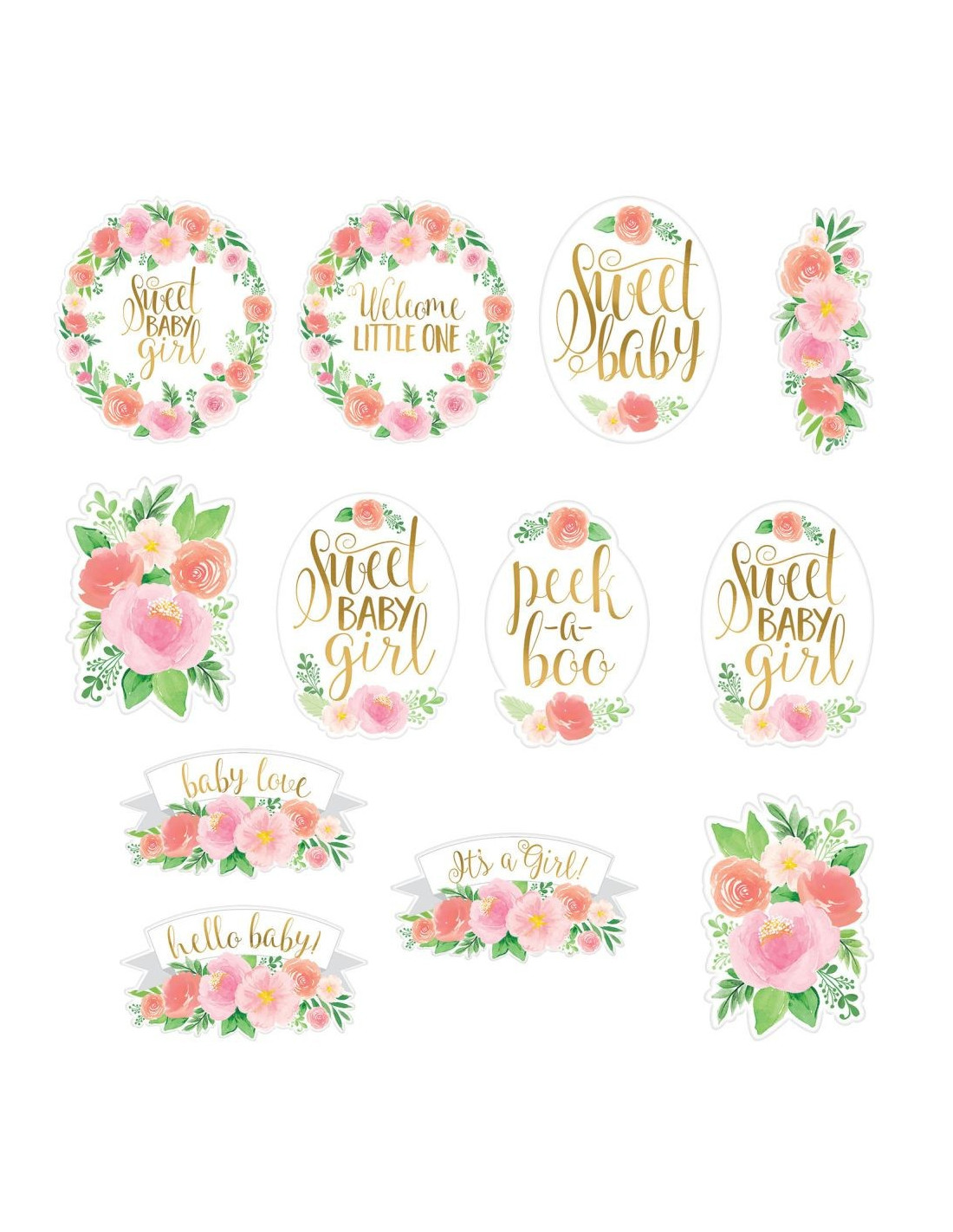 Dekorationsset aus Pappe mit rosa Vintage-Blumenmotiven und goldener Aufschrift „SWEET BABY GIRL“, „HELLO BABY“, „BABY LOVE“, „SWEET BABY“, „IT'S A GIRL“, „WELCOME LITTLE ONE“.