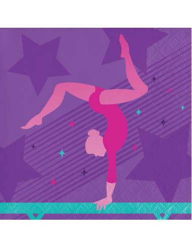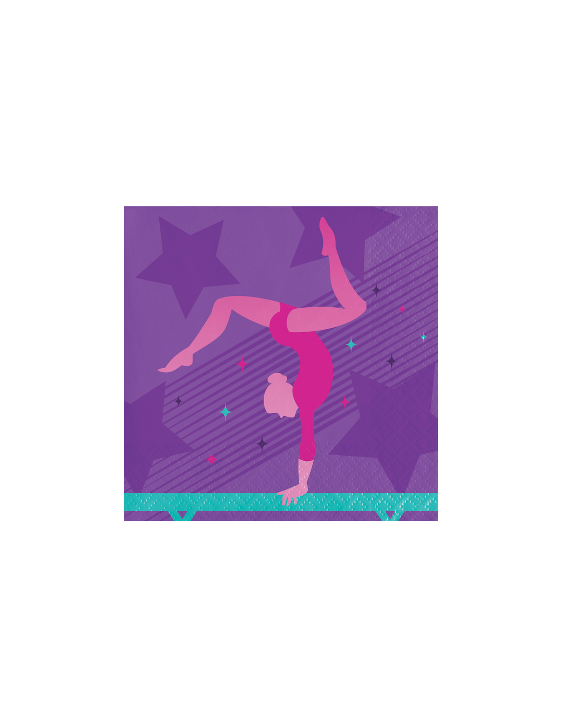 Diese mit einem Turnmotiv bedruckten Partyservietten sind aus weichem, saugfähigem, zweilagigem Seidenpapier gefertigt. Das Design zeigt eine Turnerin in Rosa und Lila.