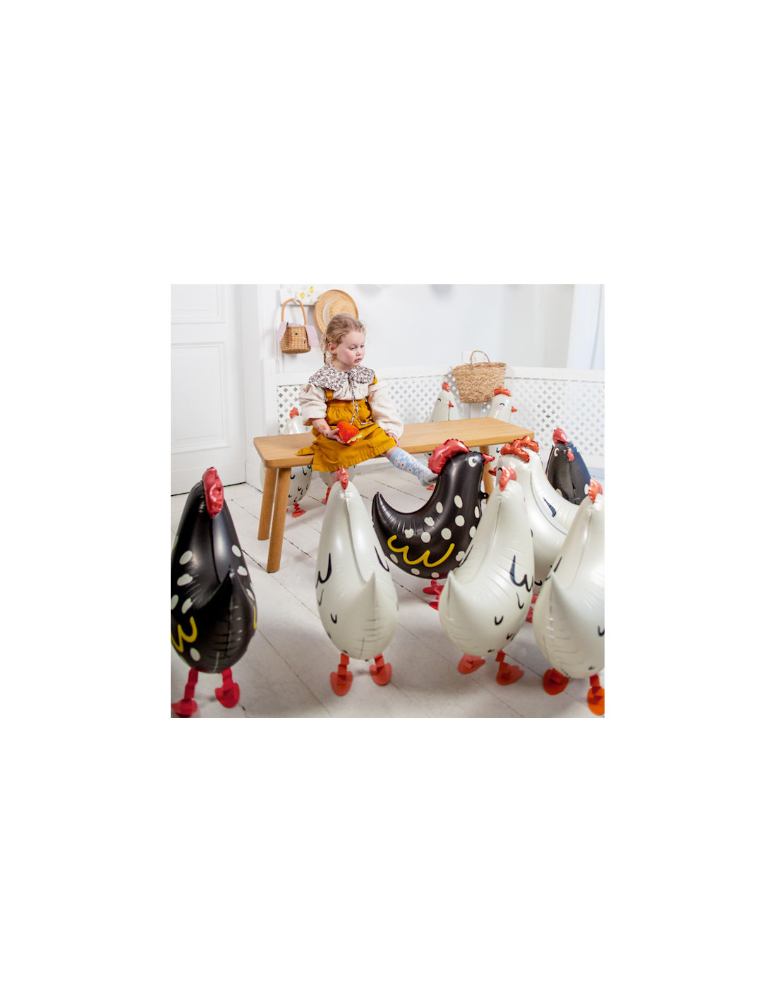 Ein weißer, hühnerförmiger Folienballon mit Papierfüßen! Super originell und vor allem super süß! Nur für Helium geeignet, damit das Huhn schwebend „laufen“ und hin und her wackeln kann. Vorne am Ballon befindet sich eine Lasche zum Zubinden und Hinterherziehen.