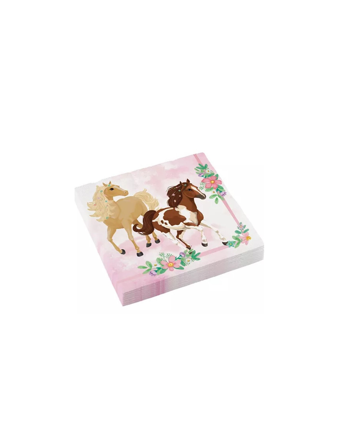 Diese wunderschönen rosa-weißen Servietten mit floralem Rand sind mit zwei prächtigen Pferden bedruckt.