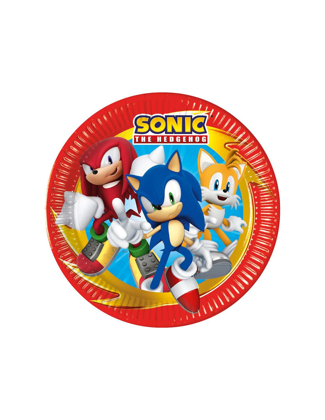 Diese FSC®-zertifizierten Teller sind rund, der Rand ist rot und in der Mitte sieht man Sonic, Knuckles und Tails auf gelbem Hintergrund mit dem Logo „Sonic the Hedgehog™“ darüber.