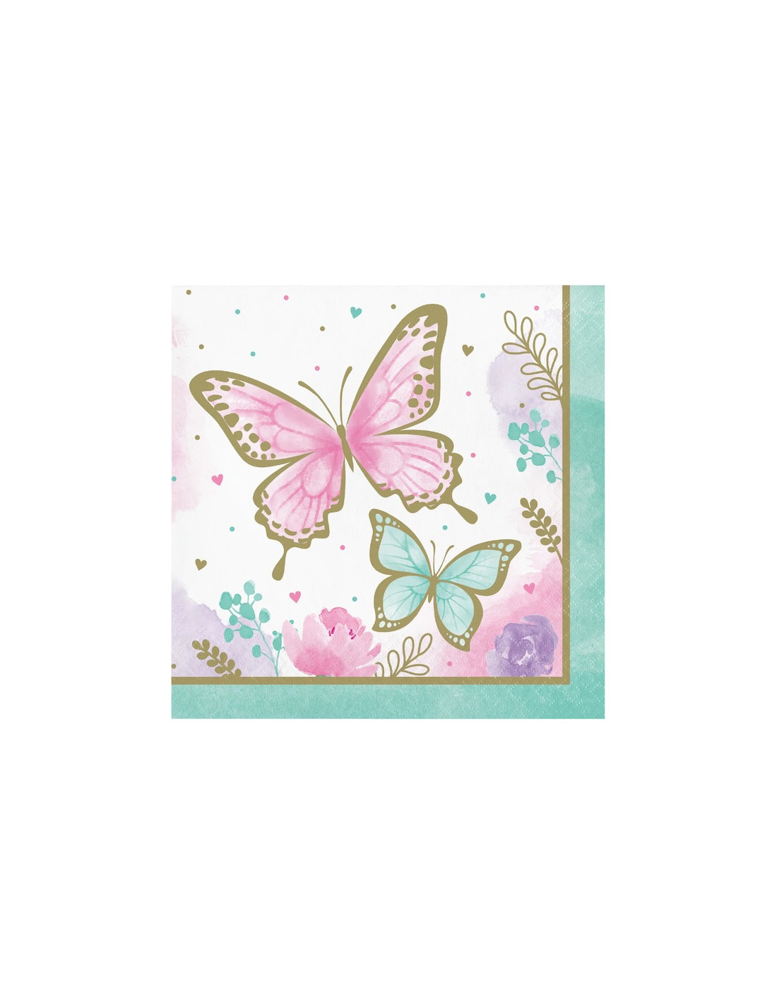 Unsere Servietten mit Schmetterlingsmotiv sind die perfekte, hübsche Ergänzung für jede Feier mit Schmetterlingsmotto. Das Design zeigt einen rosa und einen blauen Schmetterling, verziert mit goldenen Metallic-Details, Blumen, Blättern und Herzen in zarten Pastell- und Goldtönen.