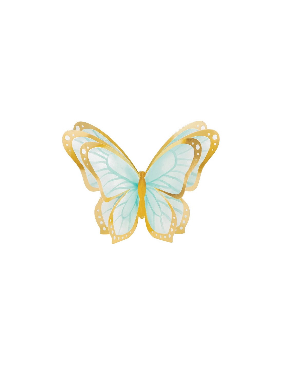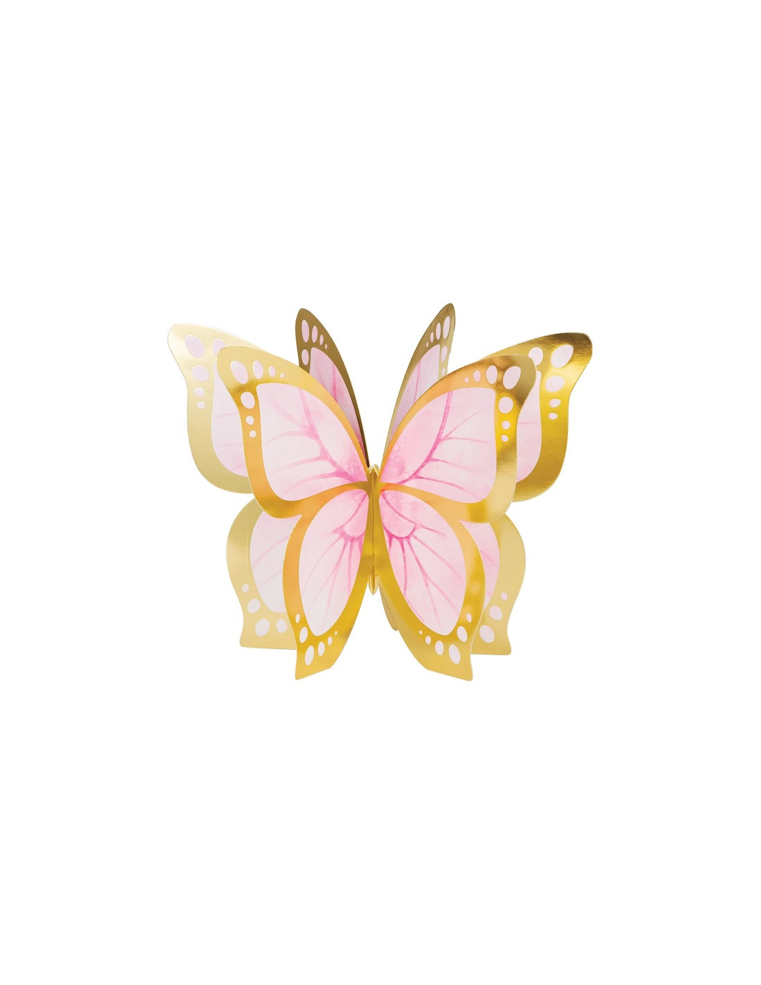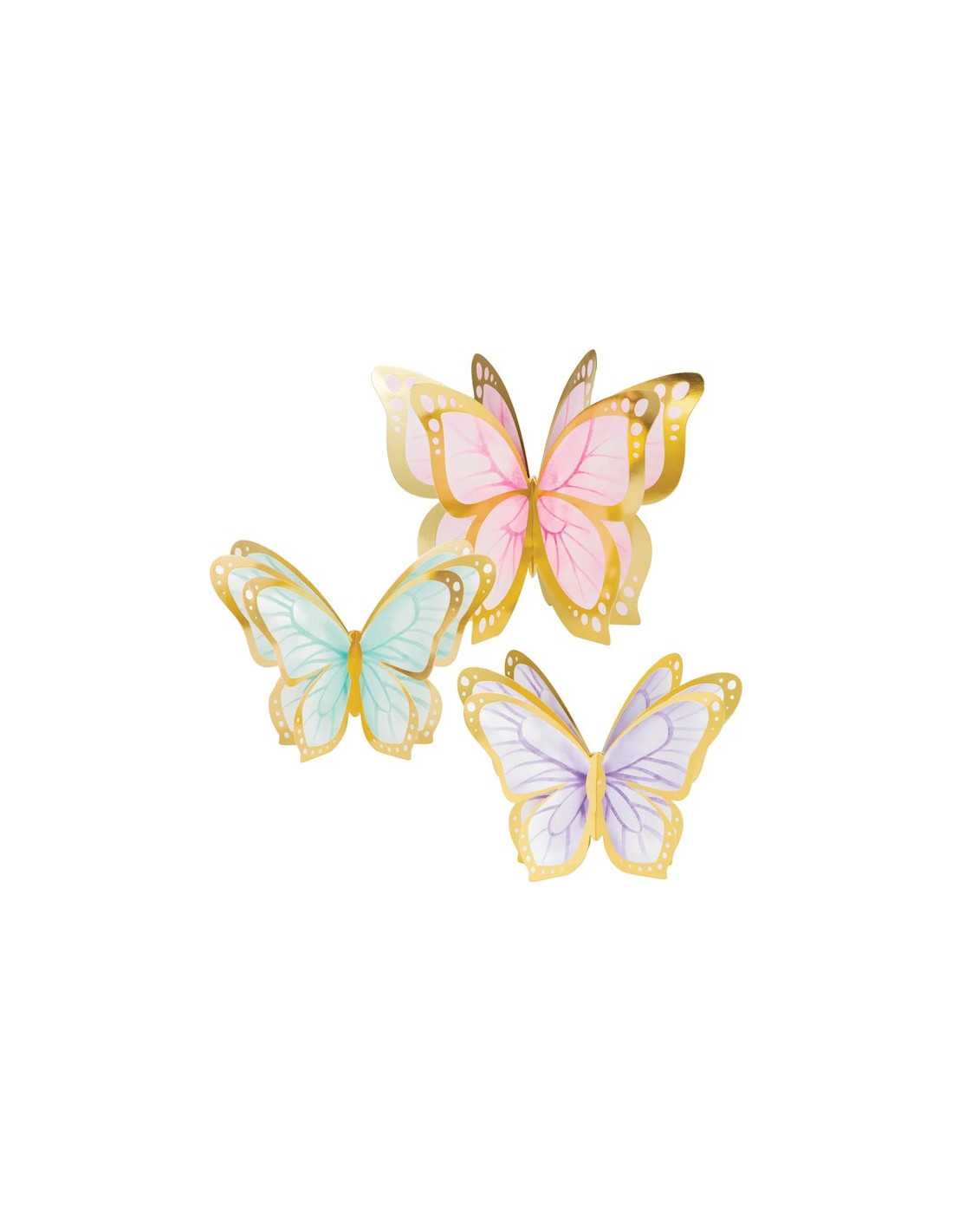 Dieses dreiteilige Tischgesteck besticht durch dreidimensionale Schmetterlinge. Die wunderschönen pastellfarbenen Schmetterlinge entfalten sich und wirken dreidimensional, sodass sie frei auf dem Festtisch platziert werden können. Die lila, rosa und türkisfarbenen Schmetterlinge sind jeweils mit goldfarbenen Metallic-Folien verziert.