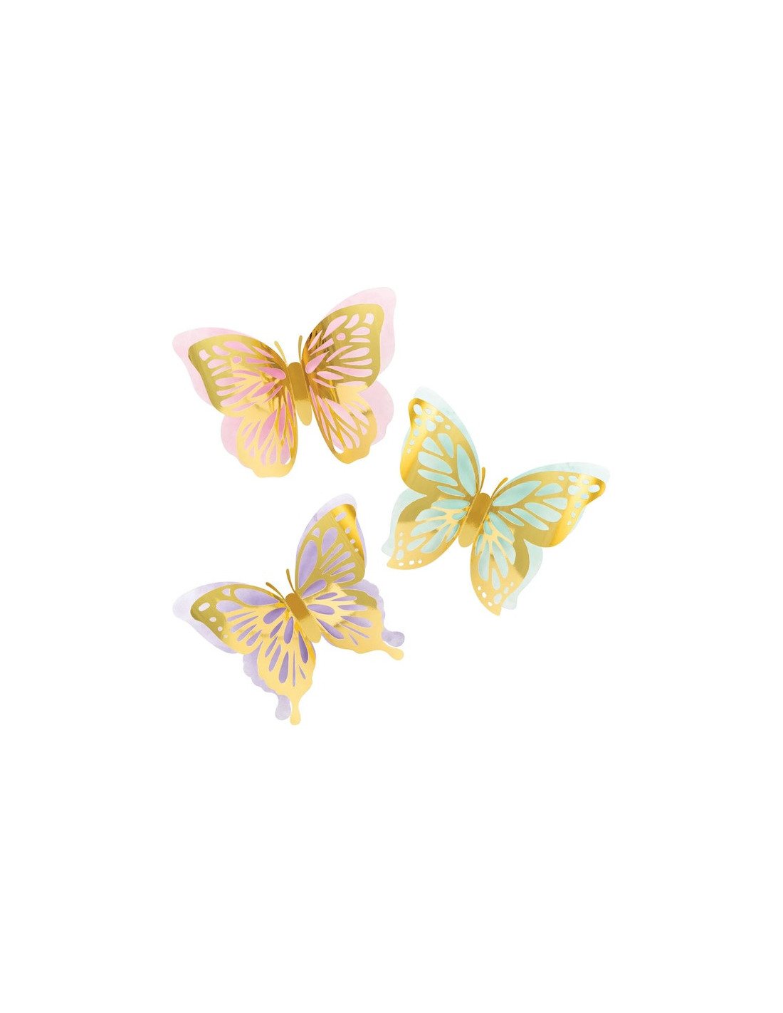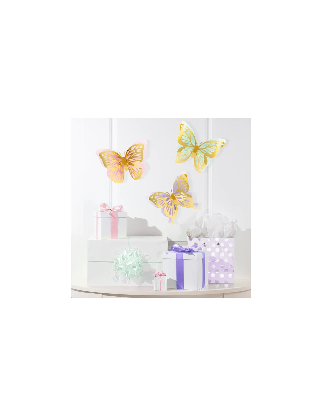 Dieses Set aus drei 3D-Wanddekorationen, bestehend aus Schmetterlingen, verleiht jeder Party eine besondere Note. Dank ihres 3D-Designs scheinen die Schmetterlinge an der Wand zu schweben. Ein wunderschöner Blickfang über der Festtagstorte oder dem Geschenketisch.