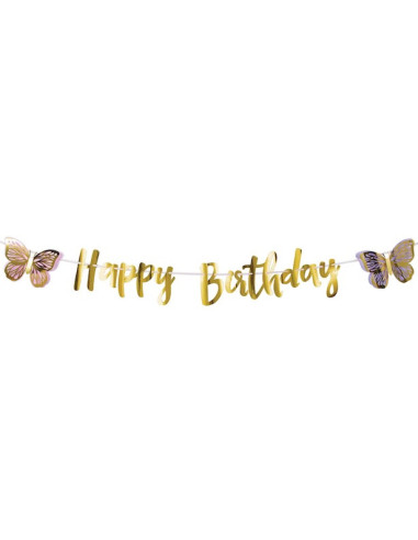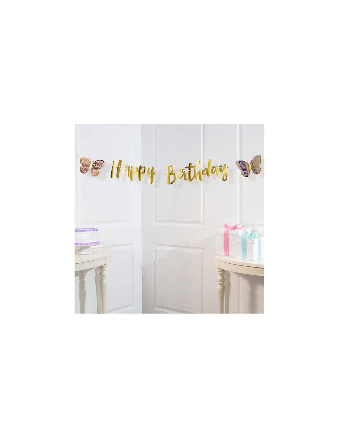 Noch nie war es so einfach, eine Geburtstagsparty mit Schmetterlingsmotto zu dekorieren! Diese Geburtstagsgirlande zeigt zwei 3D-Schmetterlinge sowie den Schriftzug „Happy Birthday“ in metallischem Gold.