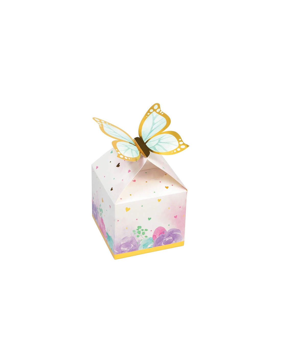 Diese einfach zusammenzubauenden „Schmetterlings“-Geschenkboxen haben die perfekte Größe für kleine Aufmerksamkeiten wie Süßigkeiten, ein Stück Kuchen, Gastgeschenke und vieles mehr. Jede Box ziert ein wunderschöner, dreidimensionaler, blauer und goldener Schmetterling auf dem Deckel, verziert mit Herzen, Blumen und Pastellfarben.