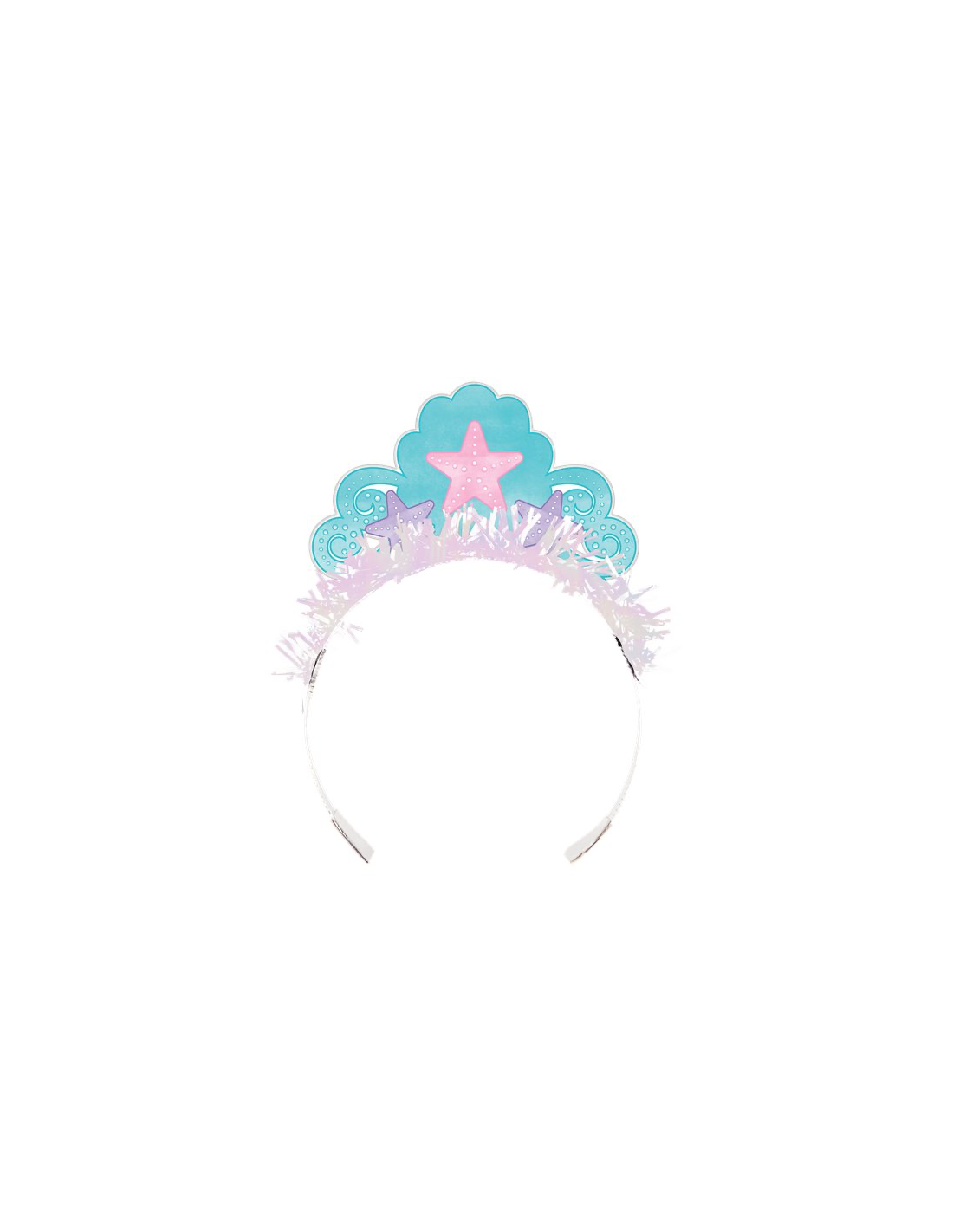 Diese Meerjungfrauenkronen aus Pappe sind türkisblau und mit zwei violetten Seesternen und einer Rose in der Mitte verziert. Am unteren Rand der Krone befinden sich schillernde Fransen .