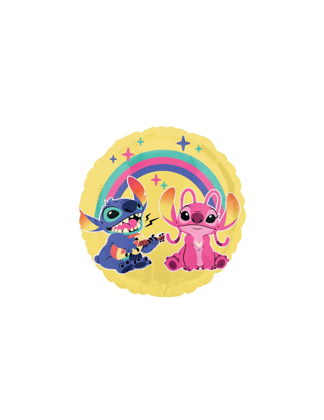 Dieser offizielle Disney™-Ballon zeigt Stitch, der zusammen mit dem bezaubernden Engel Gitarre spielt. Der gelbe Hintergrund, verziert mit einem pastellfarbenen Regenbogen und bunten Sternen, harmoniert perfekt mit dem Cartoon-Stil und den leuchtenden Farben und verleiht jeder Feier eine fröhliche Note.