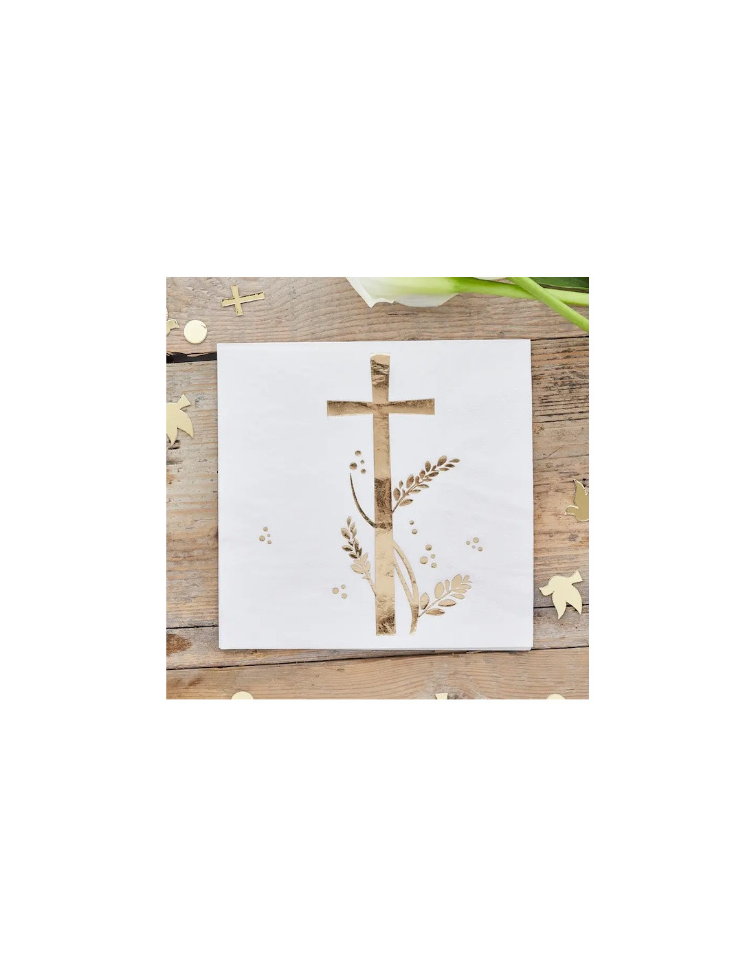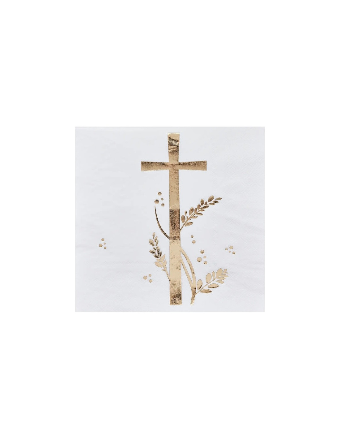 Verwenden Sie diese wunderschönen Servietten mit goldenem Kreuz für Ihre christliche Feier und dekorieren Sie Ihren Tisch für diesen besonderen Anlass auf charmante Weise. Auf weißem Grund ist im oberen Viertel der Serviette ein Kreuz mit Blattranken in edlem, schimmerndem Goldton abgebildet. Das christliche Motiv wird zusätzlich durch Punkte unterschiedlicher Größe verziert.