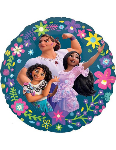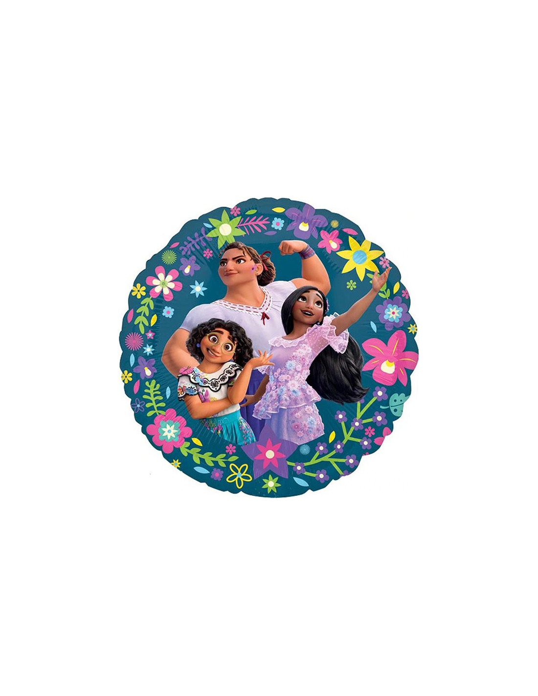 Für eine Encanto-Geburtstagsparty für ein Mädchen ist dieser hübsche Ballon genau das Richtige. Er ist rund und zeigt Luisa, Isabela und Mirabel. Die Madrigal-Schwestern sind von bunten Blumen auf blauem Hintergrund umgeben.