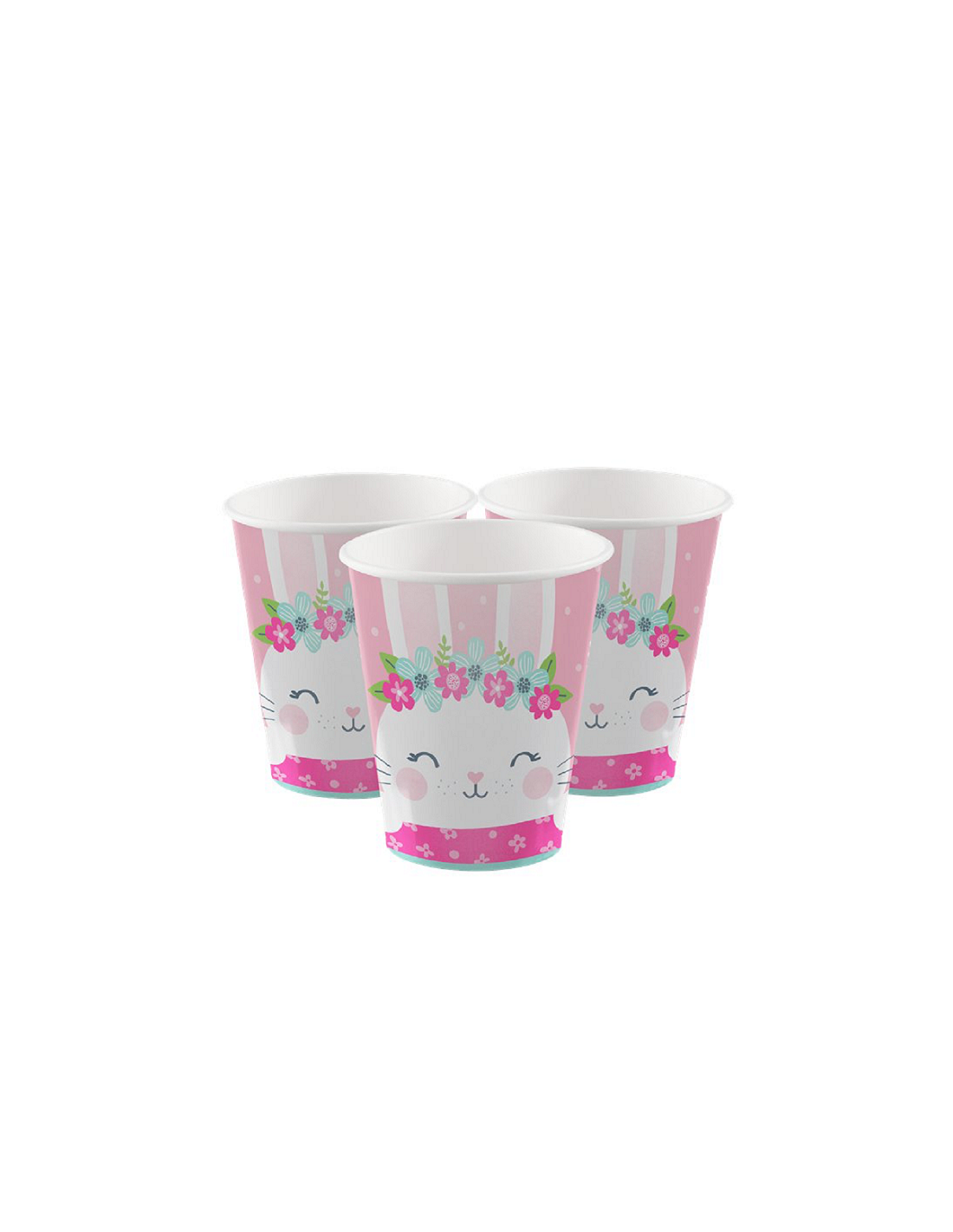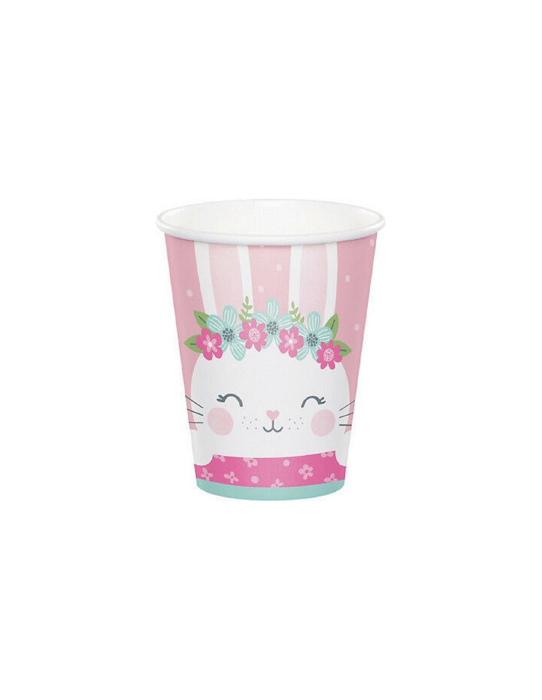 Ces gobelets sont roses à pois blancs avec une tête de lapin souriante portant une couronne de fleurs. Cette déco sera parfaite pour décorer votre fête à l'occasion du 1er Anniversaire de votre petite ou une Baby Shower.