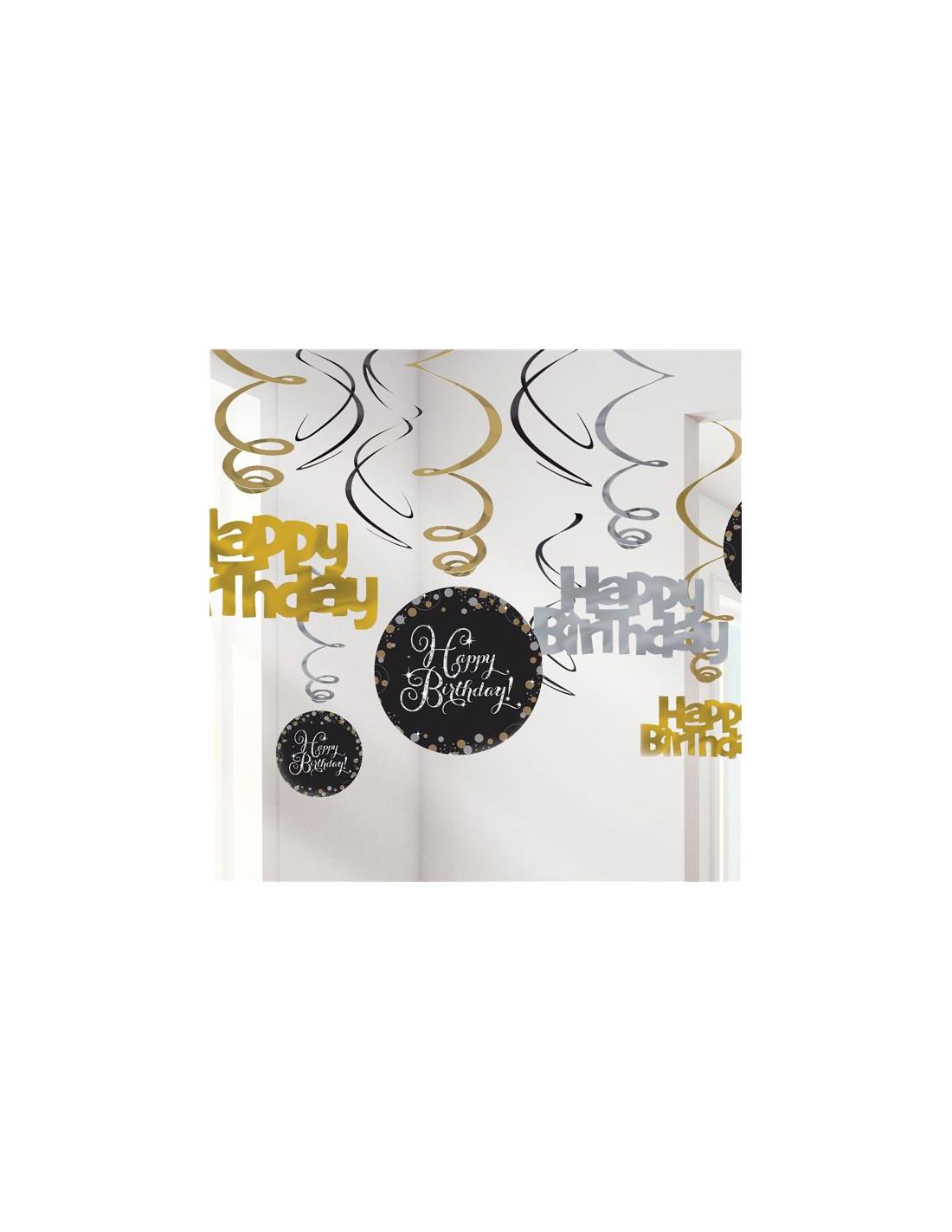 Célébrez votre anniversaire avec ces décorations « Joyeux Anniversaire » pour une célébration glamour. En noir, argent et or, ces jolis tourbillons suspendus ajouteront un éclat à vos anniversaires. Accrochez ces suspensions au plafond pour préparer le décor d'une fête parfaite.