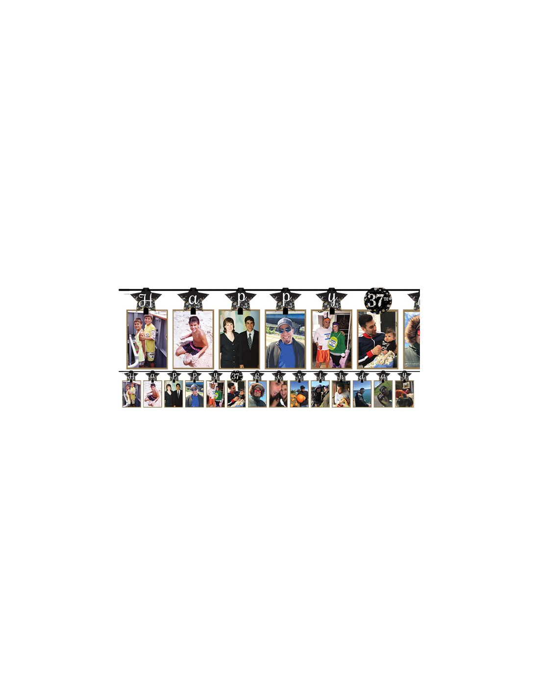 Célébrez des souvenirs spéciaux avec cette magnifique guirlande de photos d'anniversaire. Elle comporte des pinces à linge avec des découpes en étoile noire qui indiquent "Joyeux Anniversaire". Une découpe ronde vous permet de personnaliser cette bannière en ajoutant l'âge avec les autocollants inclus.