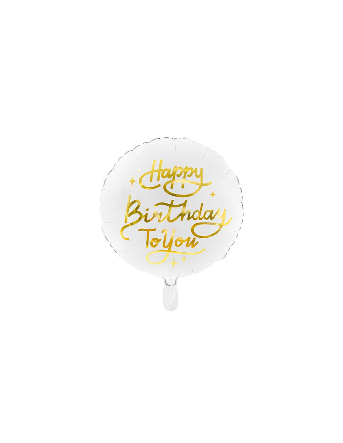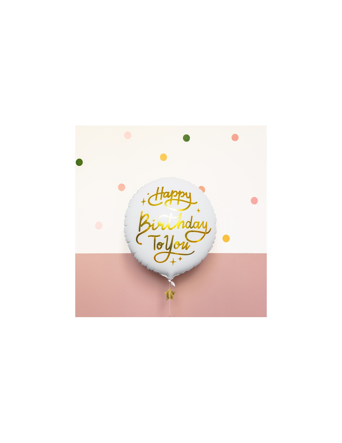 Ballon en aluminium mat de couleur blanche avec l'inscription métallique dorée "Happy Birthday To You". Il sera parfait pour décorer votre salle d'anniversaire.
