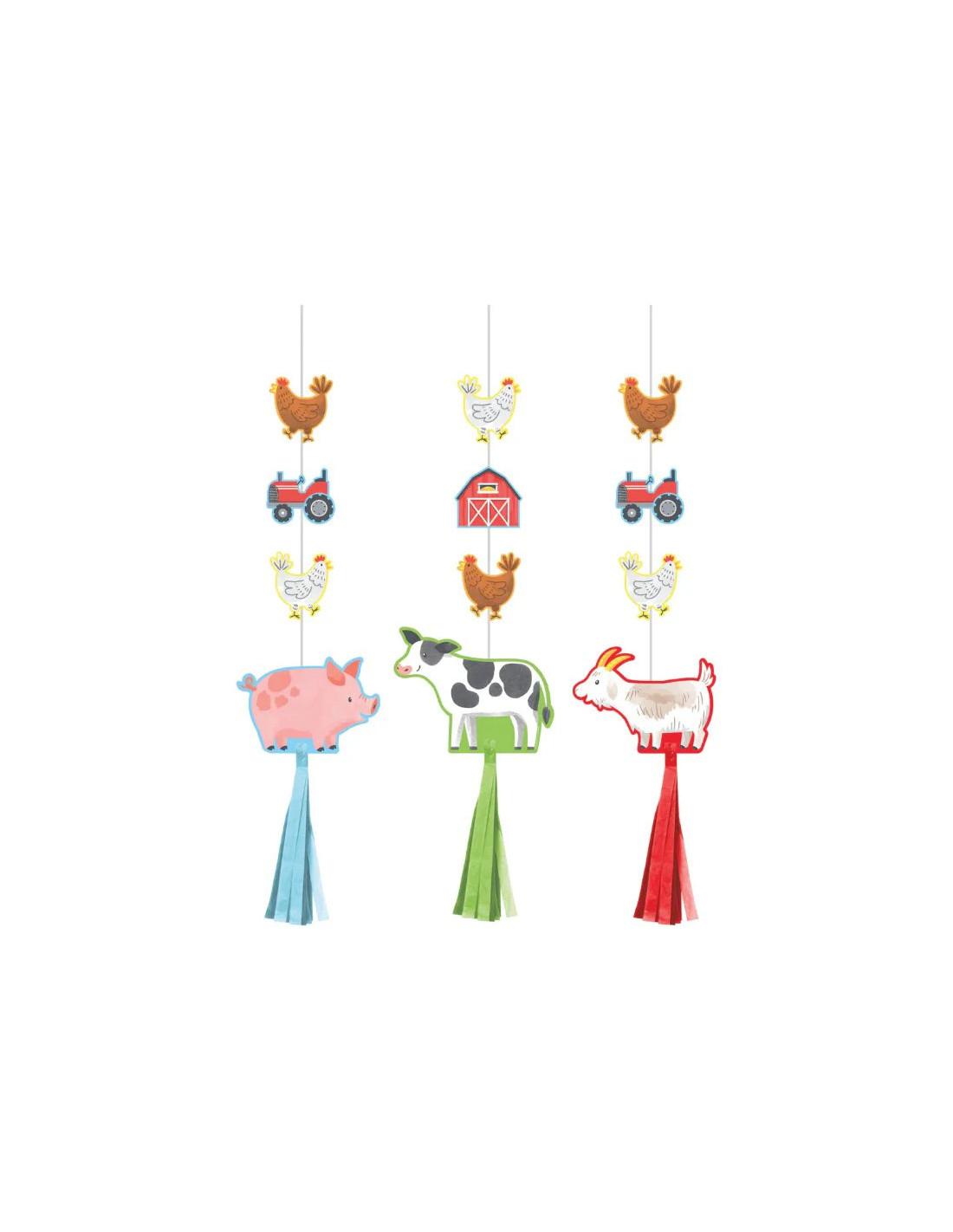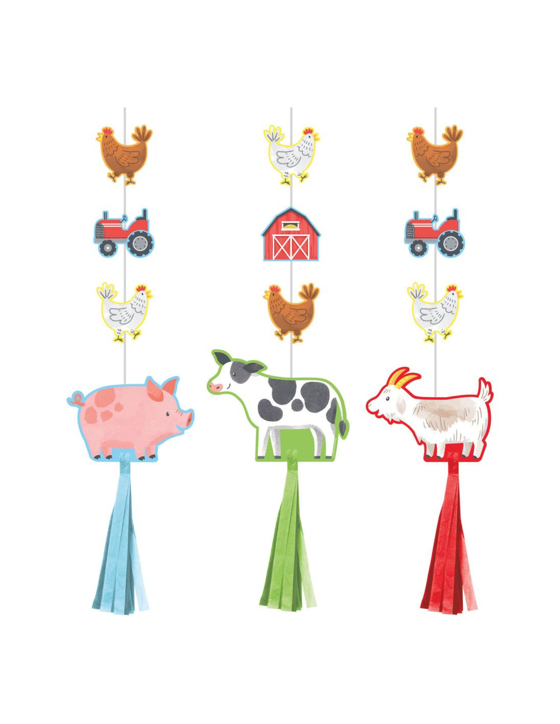 Créez une ambiance ludique et chaleureuse avec ces décorations à suspendre Animaux de la ferme. Faciles à installer, elles sont parfaites pour décorer le plafond, une porte ou un coin fête lors d’un anniversaire enfant sur le thème de la ferme.