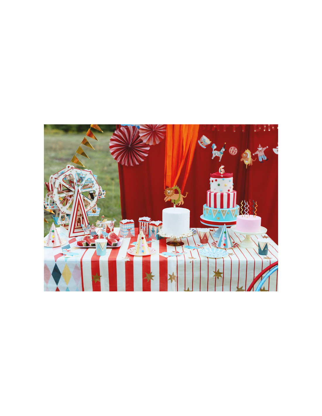 Cette nappe de table sur le thème du cirque, composée de losanges multicolores, apportera des couleurs vives à la salle de fête et s’intégrera harmonieusement avec le reste de la décoration.