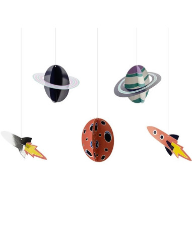 Ce lot de 5 décorations en papier à suspendre sera parfait pour un anniversaire sur le thème de l'espace et des astronautes ! Placez ces jolies suspensions en forme de planètes et de fusées au dessus de votre bar à gourmandises, associez de la décoration colorée et argentée pour une fête d'anniversaire tendance.