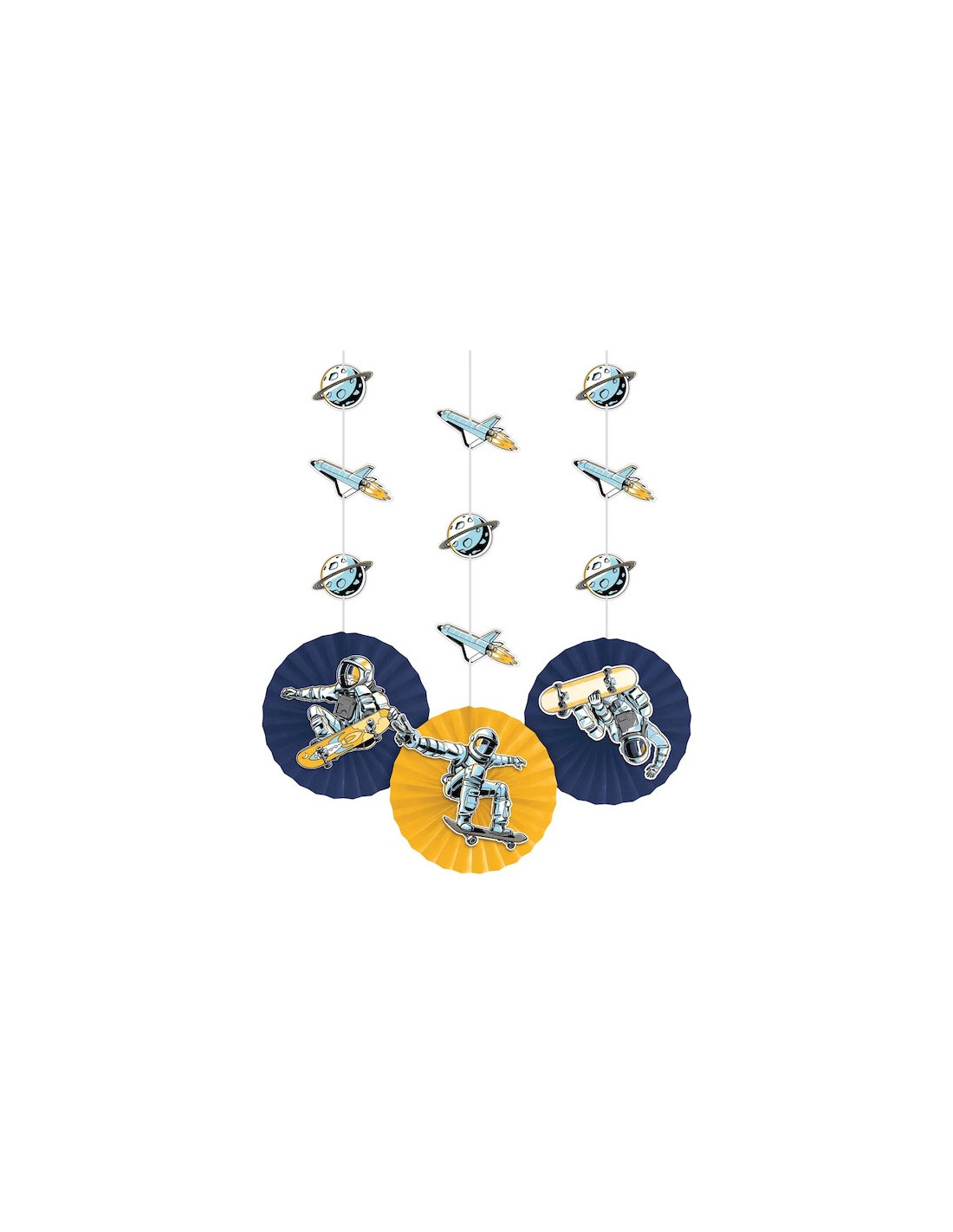 Les invités orbiteront autour de la lune lorsqu'ils verront ces décorations Espace Skater décorer la fête. Ces découpes en papier suspendues mettent en vedette des astronautes effectuant des tours de skateboard dans l'espace avec un thème bleu marine, jaune et blanc.