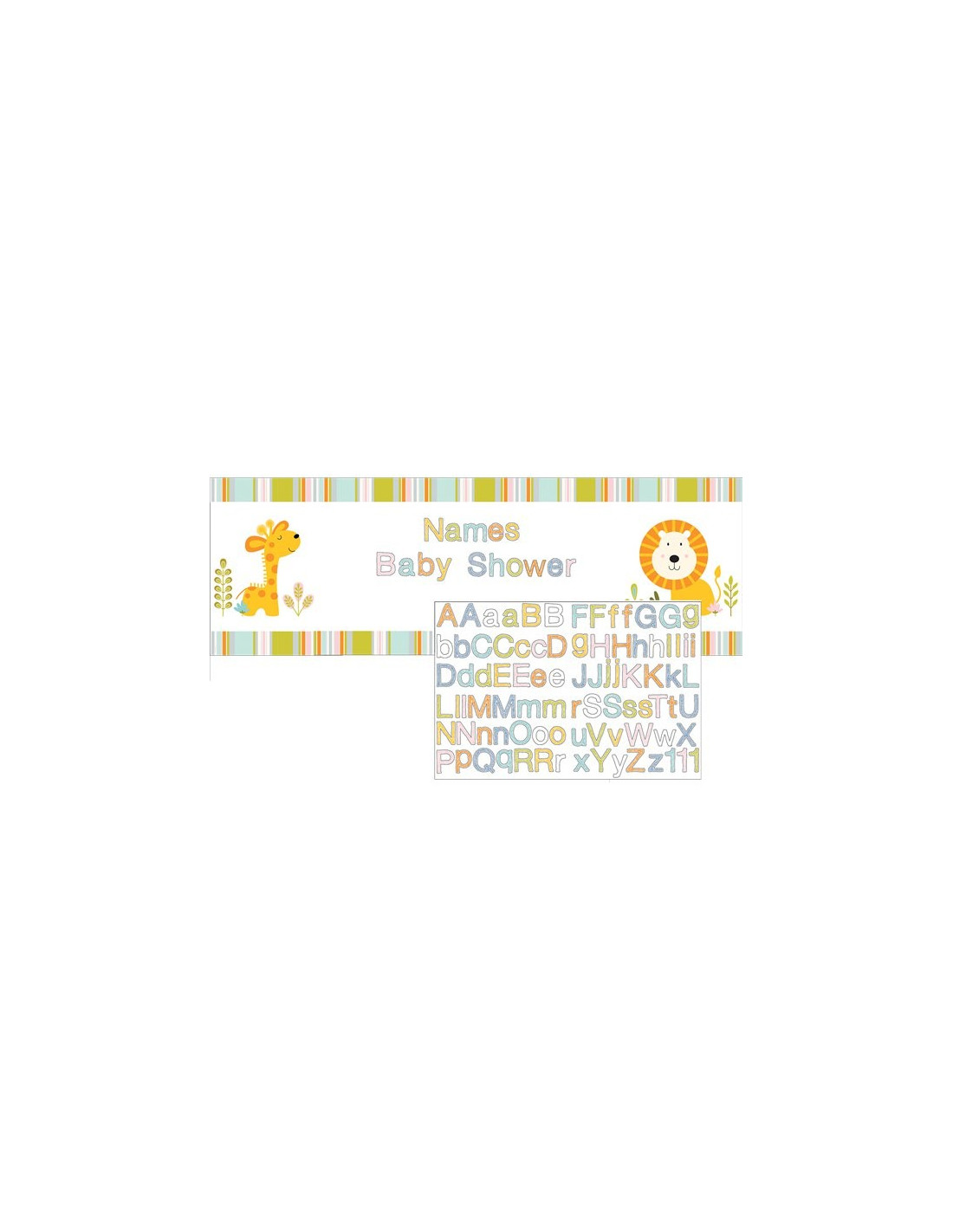 Utilisez les autocollants colorés pour ajouter un message personnel à cette bannière, que ce soit « Joyeux anniversaire » ou « Bienvenue bébé ». Le thème de cette bannière de la jungle est un adorable petit lion et une douce girafe.