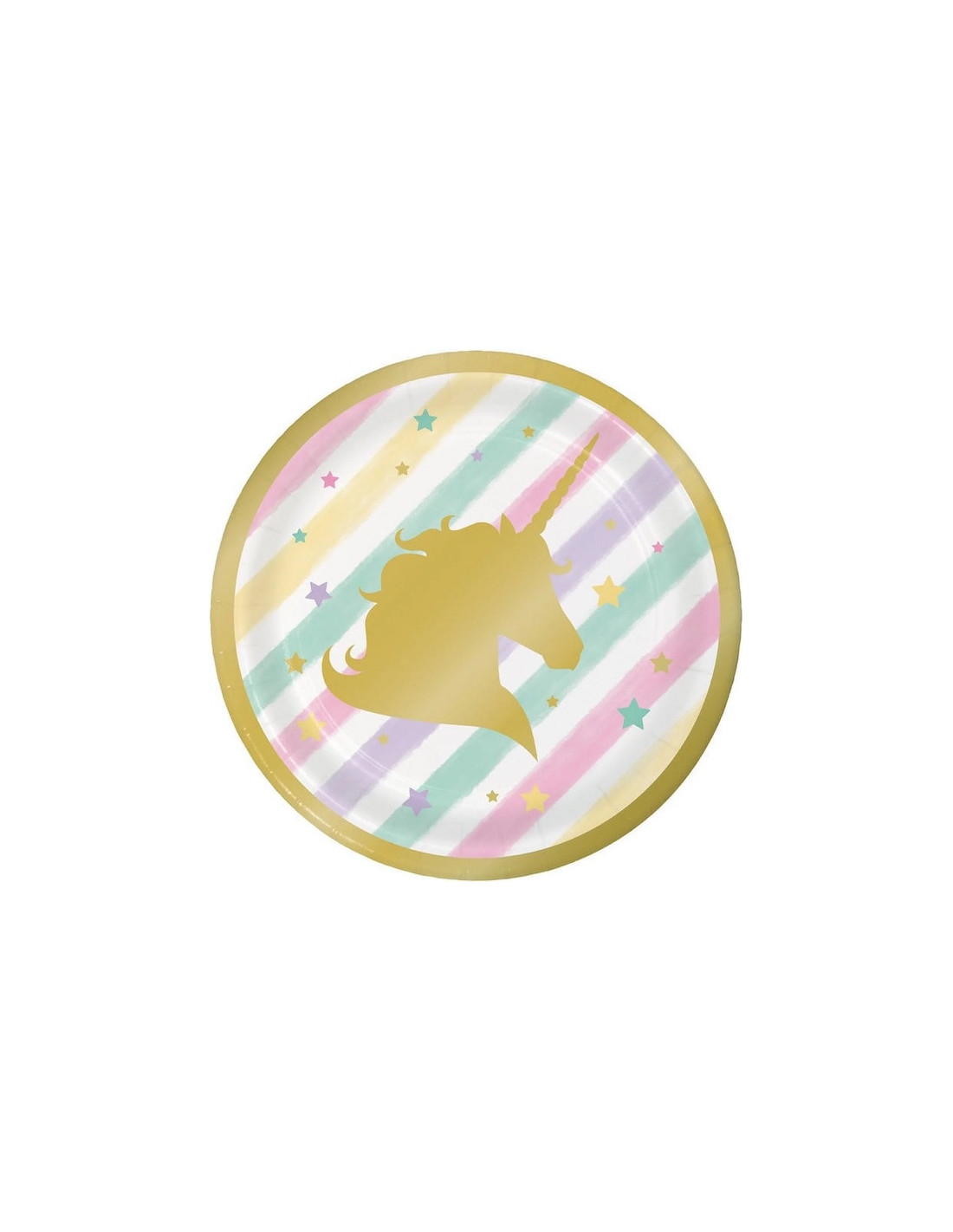 Mettez en valeur vos desserts avec ces assiettes à dessert licorne dorée, idéales pour une table d’anniversaire élégante et féerique. Leur format compact est parfaitement adapté pour servir gâteaux, cupcakes et petites douceurs, tout en apportant une touche de magie grâce aux finitions dorées et arc-en-ciel pastel.