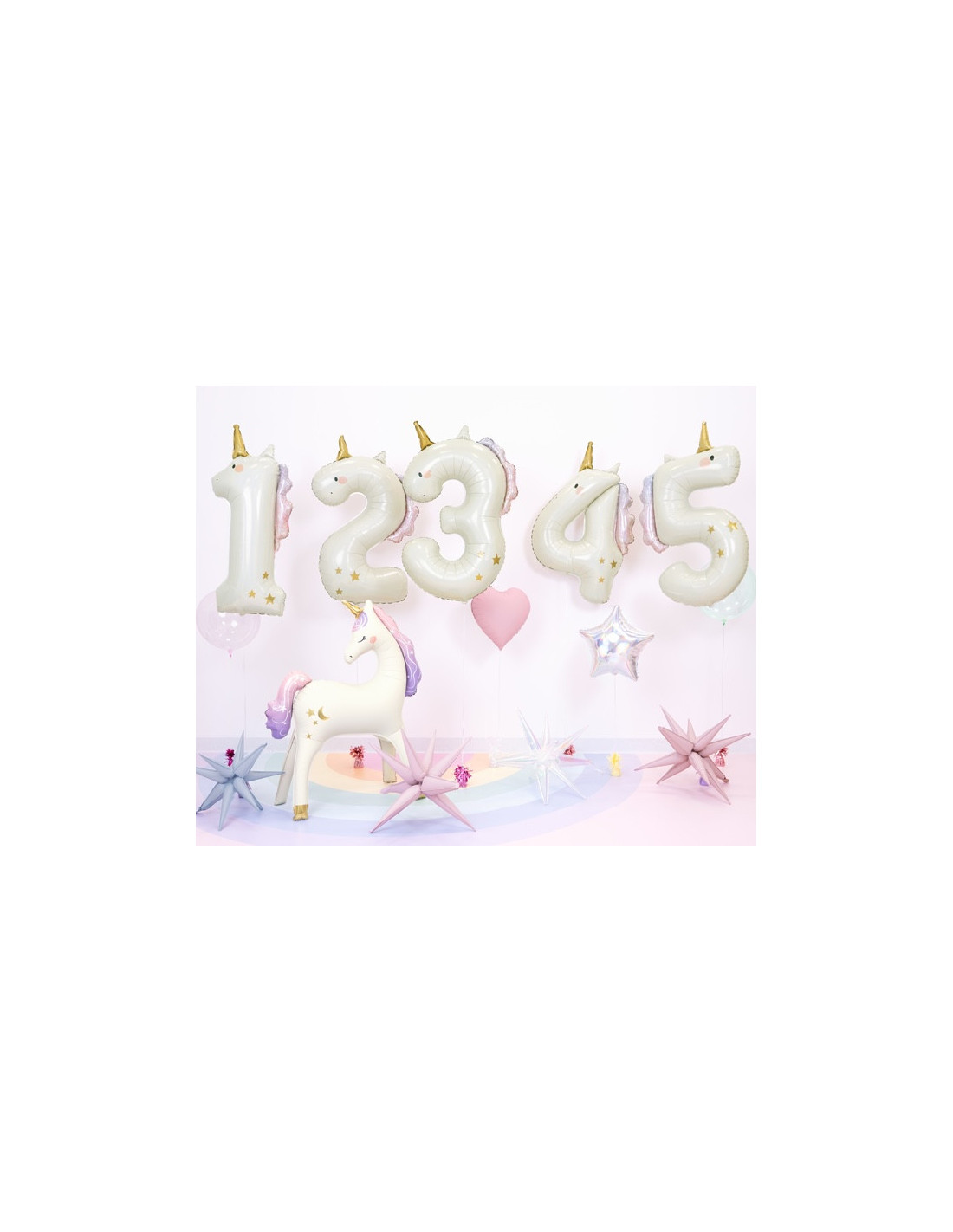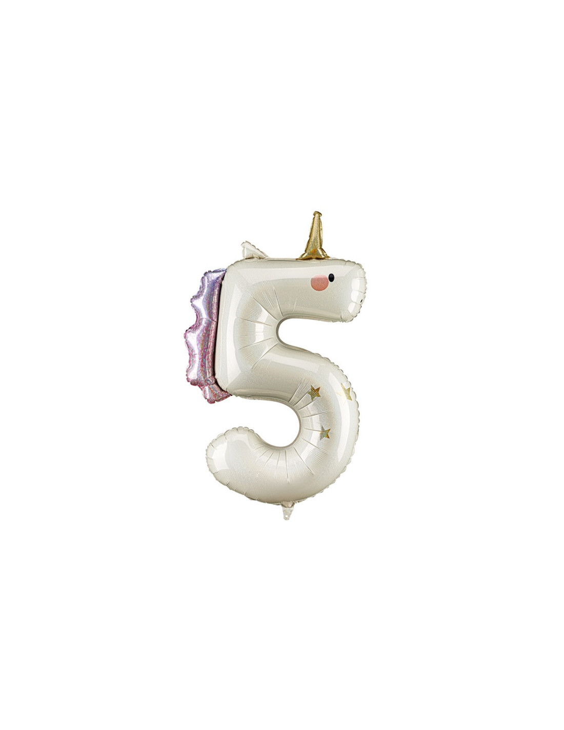 Ballon aluminium chiffre 5 – Licorne, de couleur crème avec effet holographique, décoré de détails rose clair et dorés de 120 cm