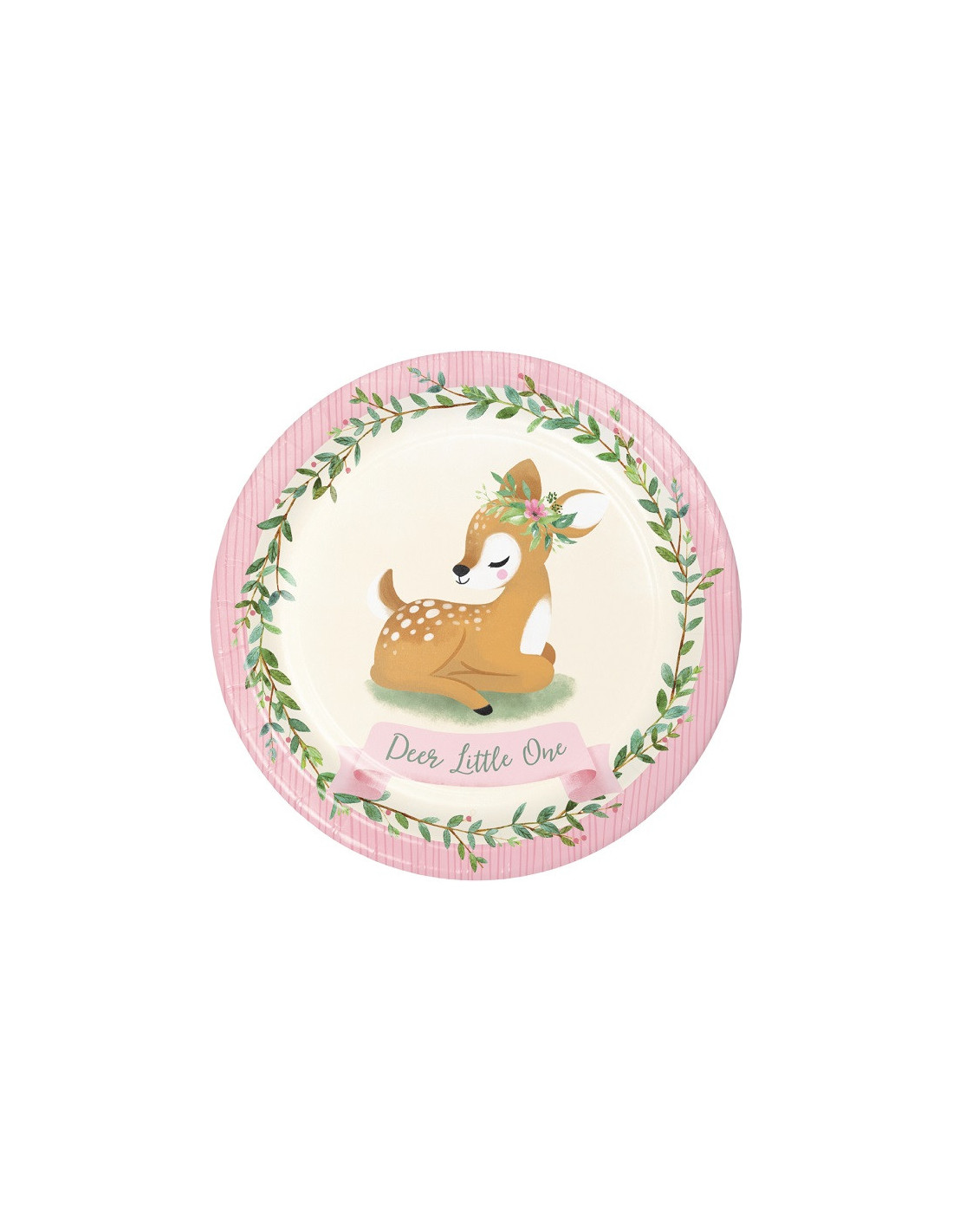 Ces jolies assiettes en papier ne devraient pas manquer à votre décoration de fête à thème "Deer Little One" lors d'une Baby Shower ou un Anniversaire. Elles sont dans les tons rose et ivoire représentant un petit faon entouré de motifs floraux.