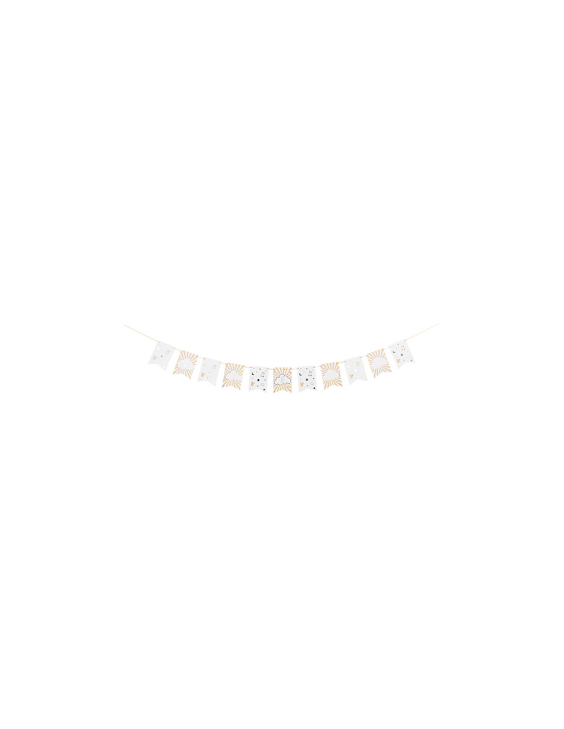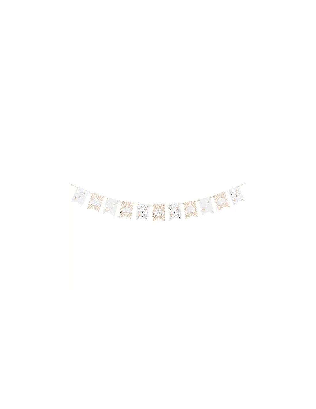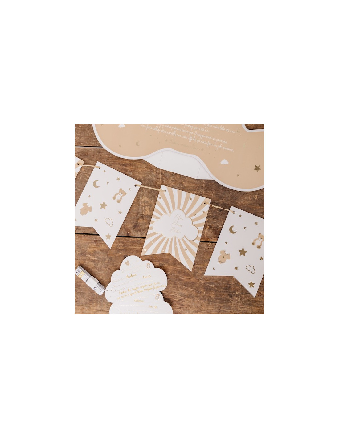 Optez pour cette magnifique guirlande, parfaite pour décorer à l'occasion d'une gender reveal, baby shower, baptême ou premier anniversaire. Elle est composée de 11 fanions en papier sur lesquels on retrouve un nuage avec l'inscription " Mon doux bébé " ainsi que des motifs comme des nuages, bodys, lunes, nounours et étoiles dans des teintes de camel, blanc et or. Ces fanions sont en carton, un ruban de satin doré vous permettra d'accrocher facilement cette jolie guirlande.
