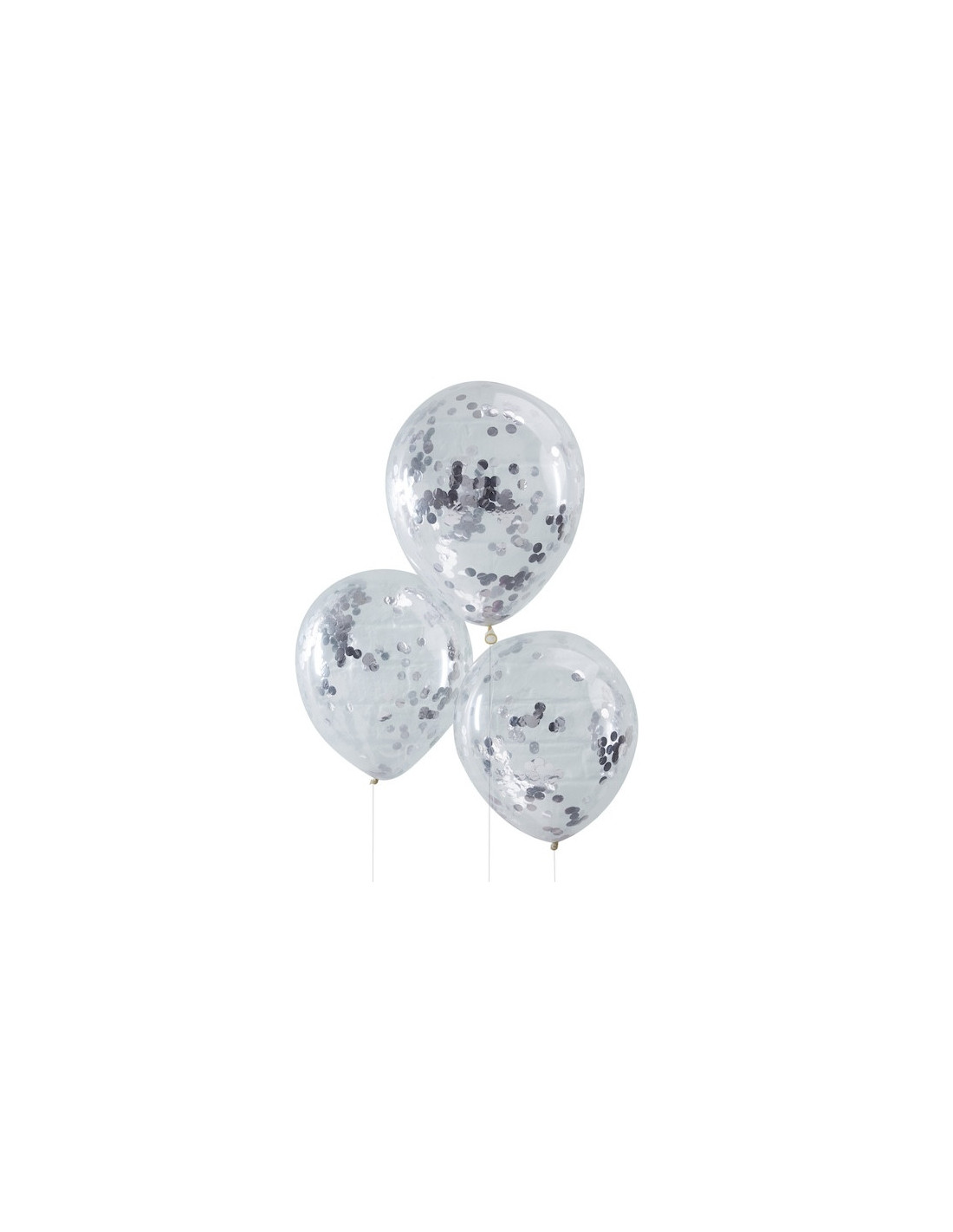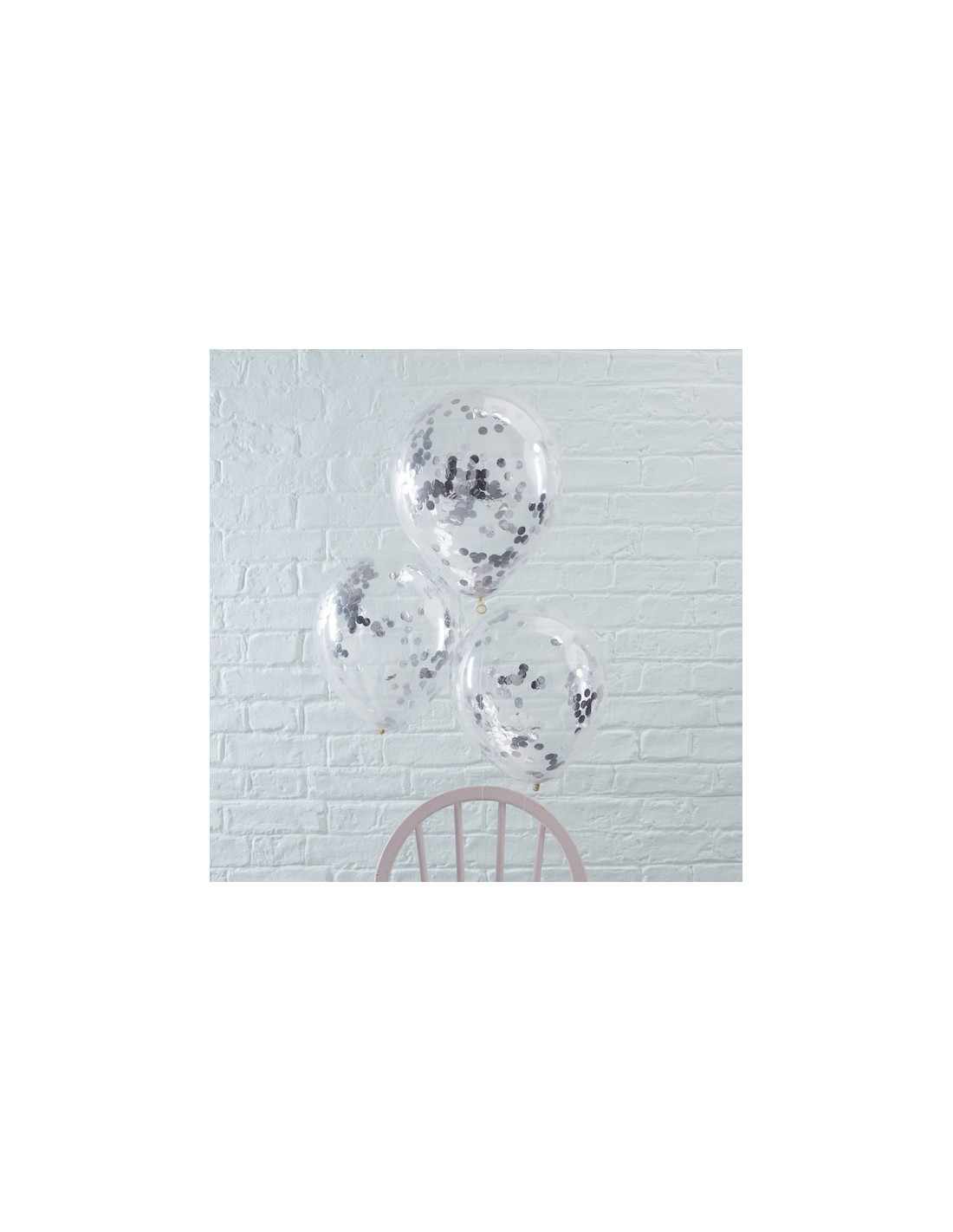 Paquet de 5 ballons en latex transparent de 30 cm et confettis argentés