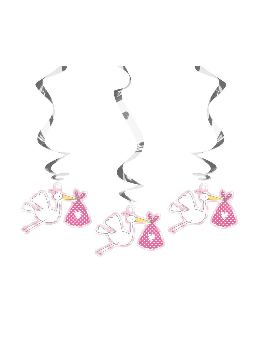 3 Décorations de fête à suspendre Cigogne Rose - Déco Baby Shower