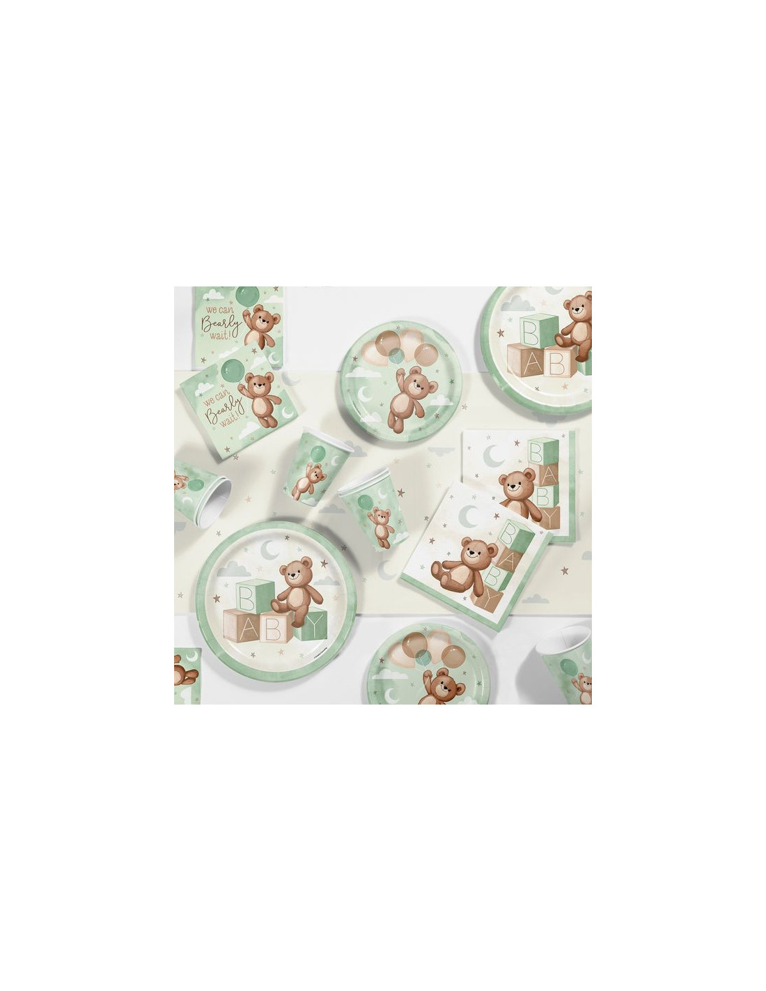 Craquez pour ces assiettes Teddy Bear, idéales pour une baby shower douce et pleine de tendresse. Leur design délicat met en scène un adorable ourson assis sur des cubes “BABY”, entouré de nuages, étoiles et lune, dans un univers apaisant aux tons vert, beige et brun. Un visuel parfait pour créer une ambiance chaleureuse et harmonieuse autour de votre table. Pratiques et décoratives, ces assiettes sont parfaites pour servir repas, snacks ou gourmandises, tout en sublimant votre décoration de fête.