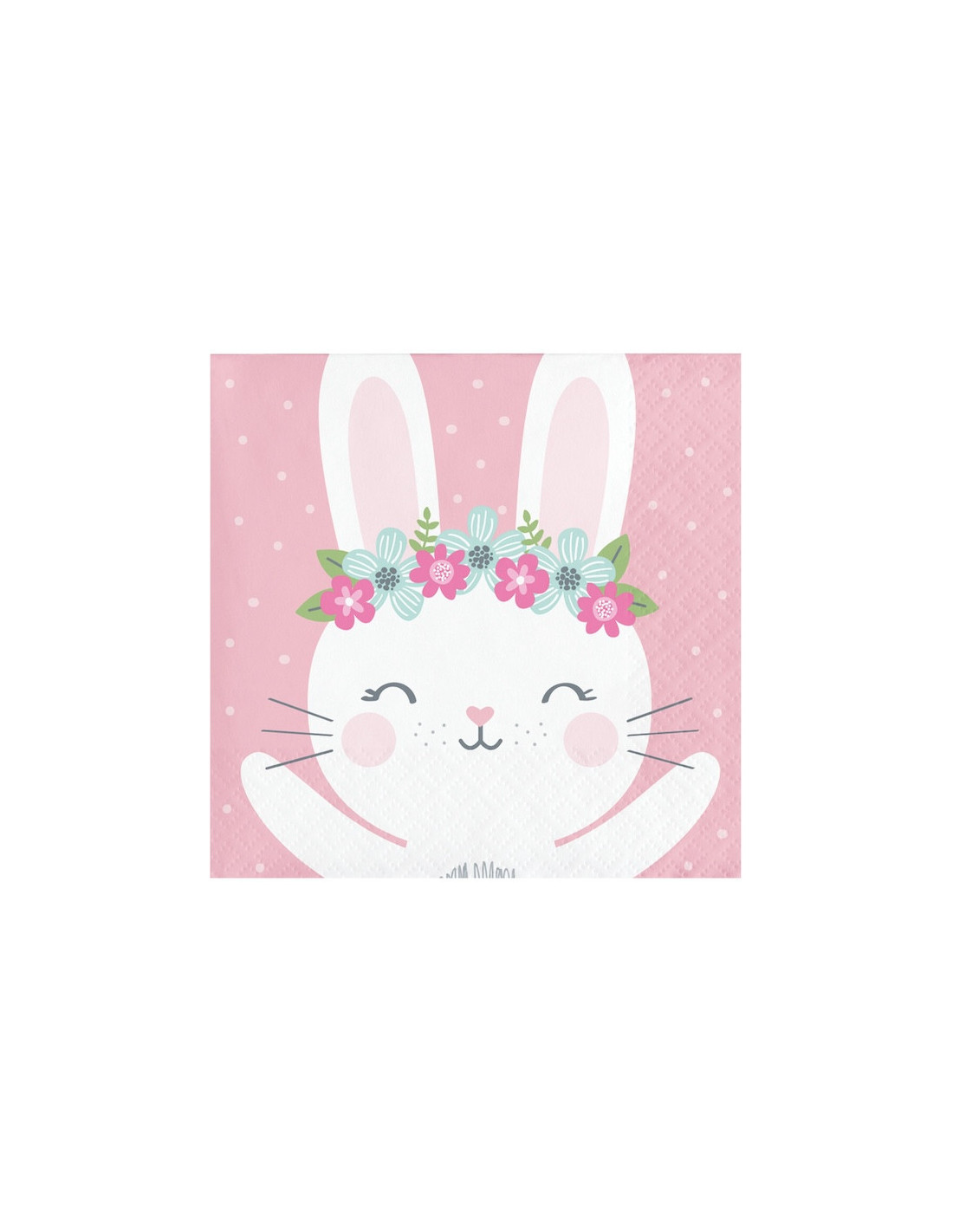 Questi tovaglioli di carta sono rosa chiaro con piccoli pois bianchi e un coniglietto sorridente con un cappello da compleanno a fiori al centro. Sono perfetti per decorare la tua festa per il primo compleanno del tuo piccolo o per un baby shower.
