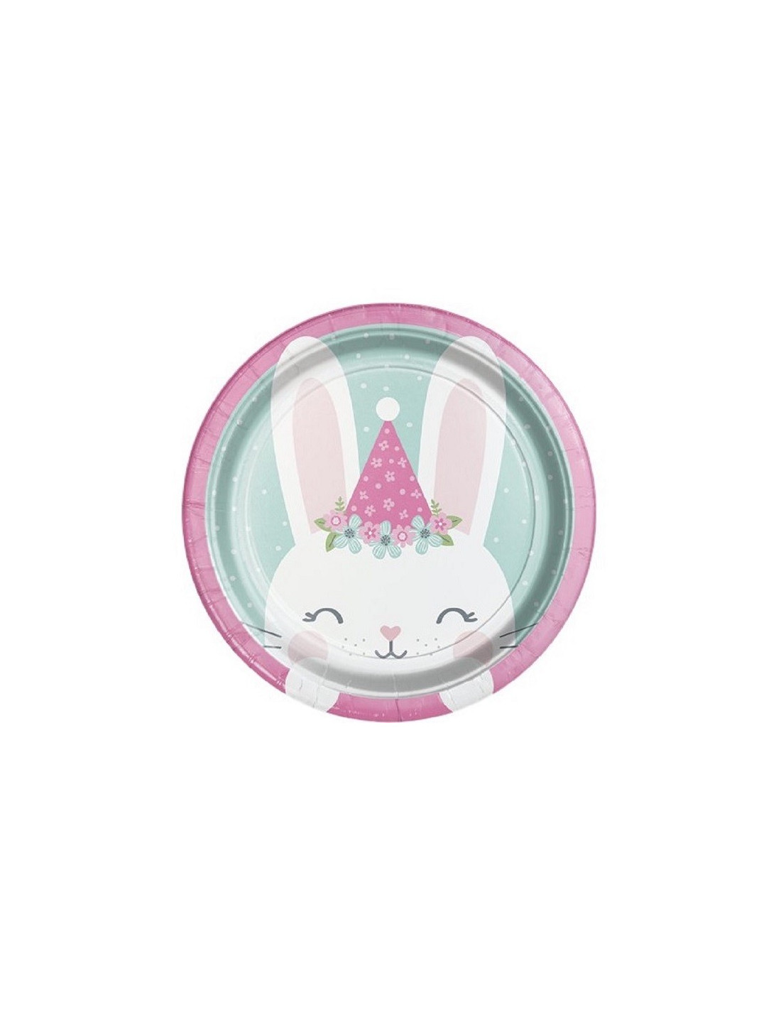 Questi piatti di cartone sono rosa su uno sfondo verde menta con pois bianchi e un piccolo coniglio con un cappello a forma di fiore sulla testa. Saranno perfetti per decorare la festa del primo compleanno del tuo piccolo o per un baby shower.