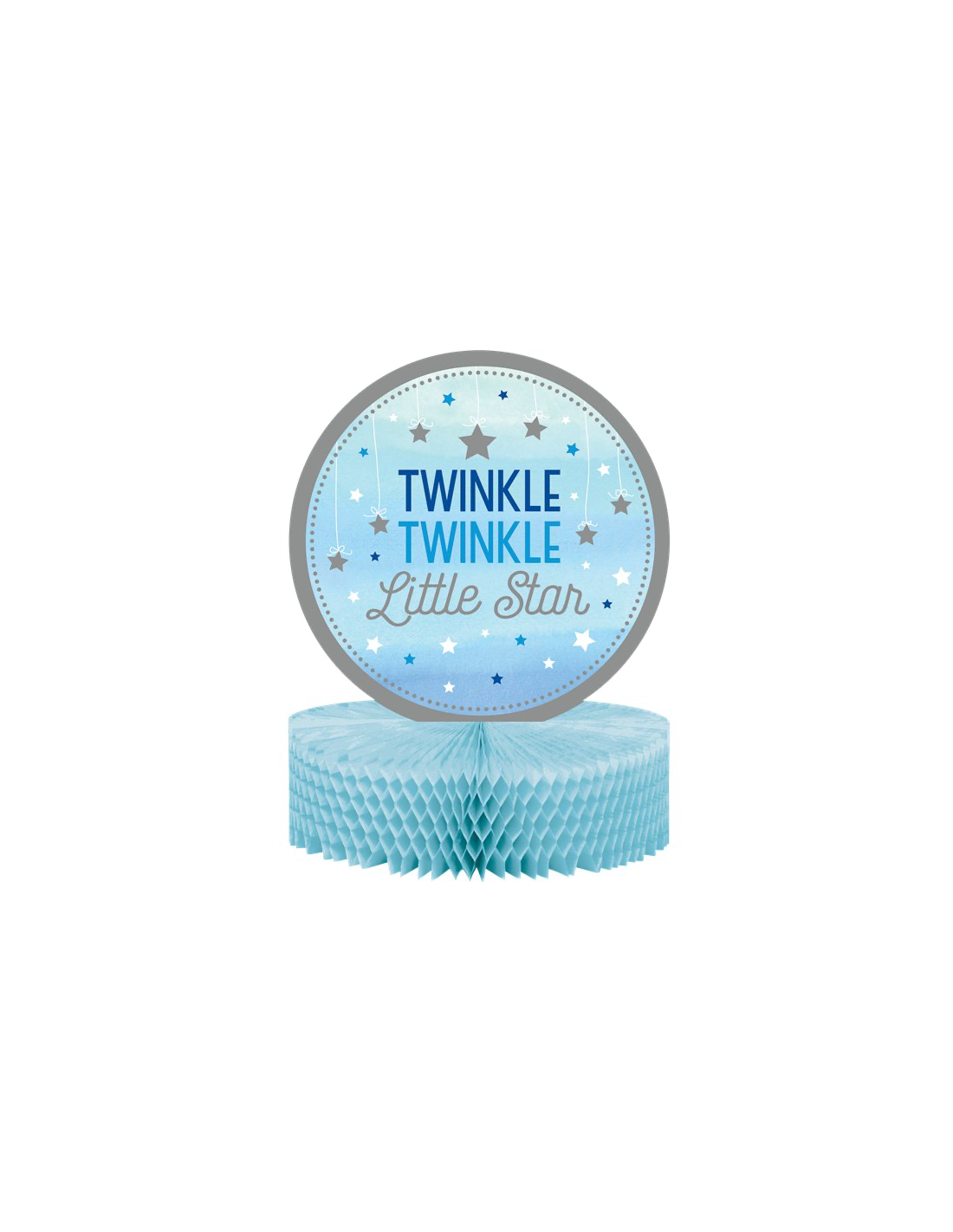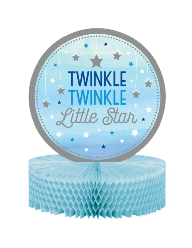 Questa decorazione da tavolo è perfetta per una festa del primo compleanno . Realizzata in nido d'ape blu, presenta una decorazione circolare con bordo argentato e la scritta "Twinkle Twinkle Little Star" .