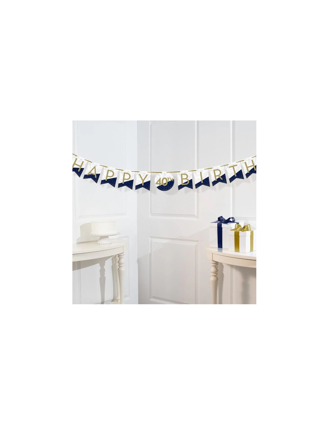 Aggiungi un tocco di eleganza alla tua festa con questo striscione "Buon Compleanno" nei toni del blu navy, oro e bianco. Tra le parole "Happy" e "Birthday", un bandierina rotonda personalizzabile ti permette di aggiungere l'età del festeggiato utilizzando gli adesivi inclusi, per una decorazione davvero unica.