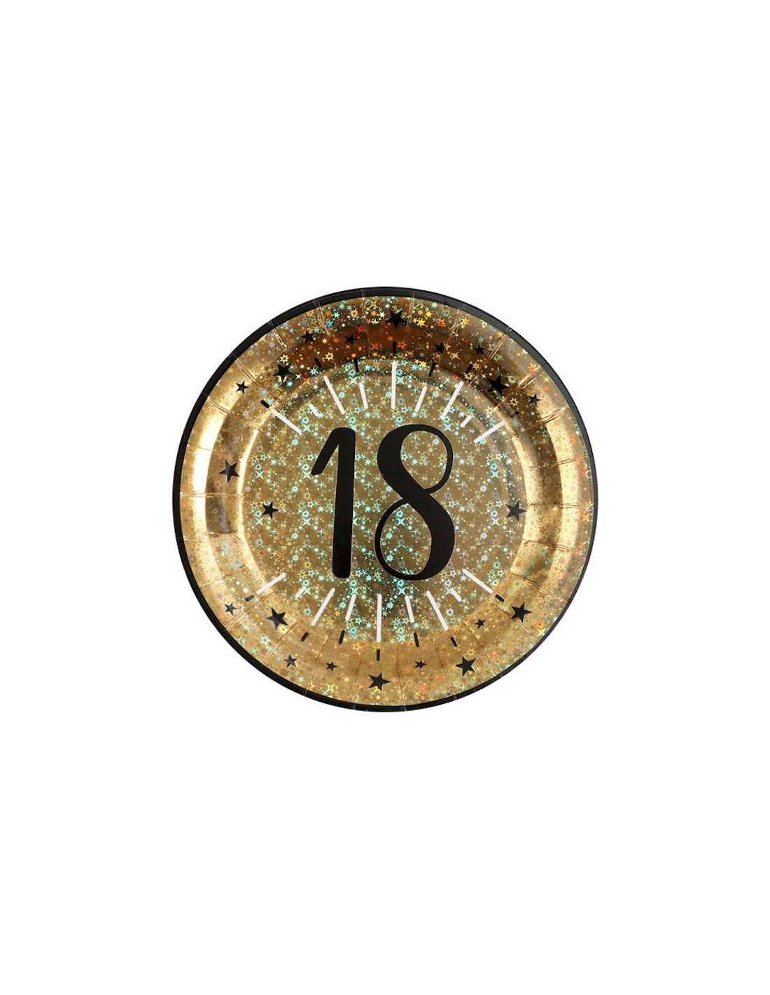 Cerchi una tavola scintillante per festeggiare il tuo 18° compleanno? Scopri questa elegante collezione oro e nero. Questi piatti presentano il numero "18", stelle filanti e stelle nere, per celebrare con stile questo anniversario indimenticabile.