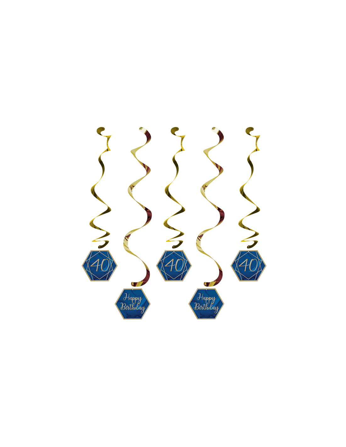 Queste graziose decorazioni a spirale sono blu navy e oro e presentano esagoni in un motivo geometrico, sui quali sono stampate le lettere dorate "40" e "Happy Birthday".