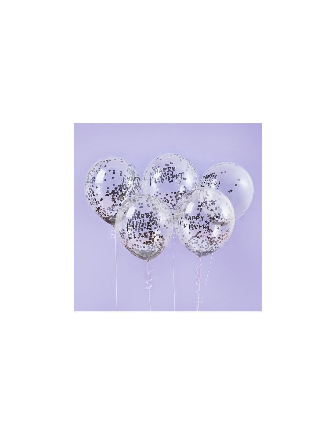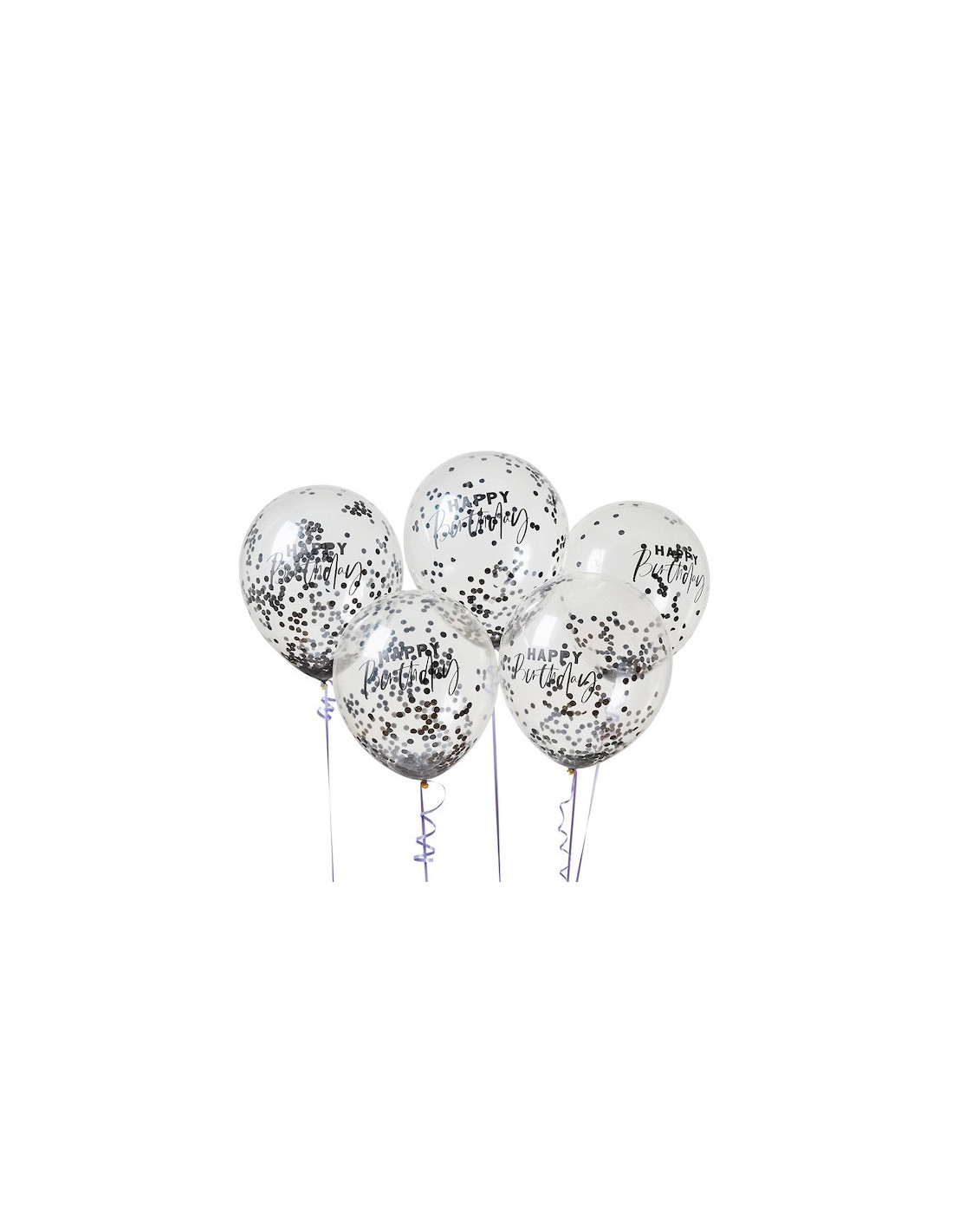 Aggiungi un tocco di eleganza alla tua festa con questi palloncini neri con coriandoli e la scritta "Buon Compleanno".