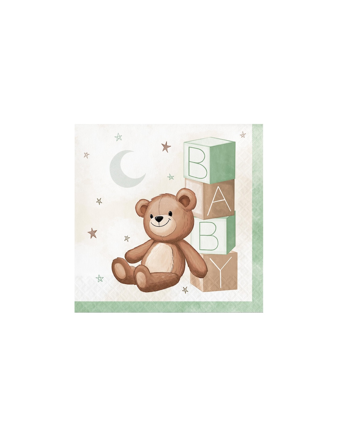 Aggiungete un tocco di dolcezza alla vostra tavola con questi tovaglioli con orsetto, perfetti per un baby shower elegante e tenero. Illustrati con un adorabile orsetto, creano un'atmosfera calda e si integrano perfettamente in una palette di colori naturali come il verde, il beige e il marrone. Pratici e decorativi, sono l'accompagnamento ideale per torta, bevande e dolcetti, completando alla perfezione il tema del vostro baby shower a tema orsetto.