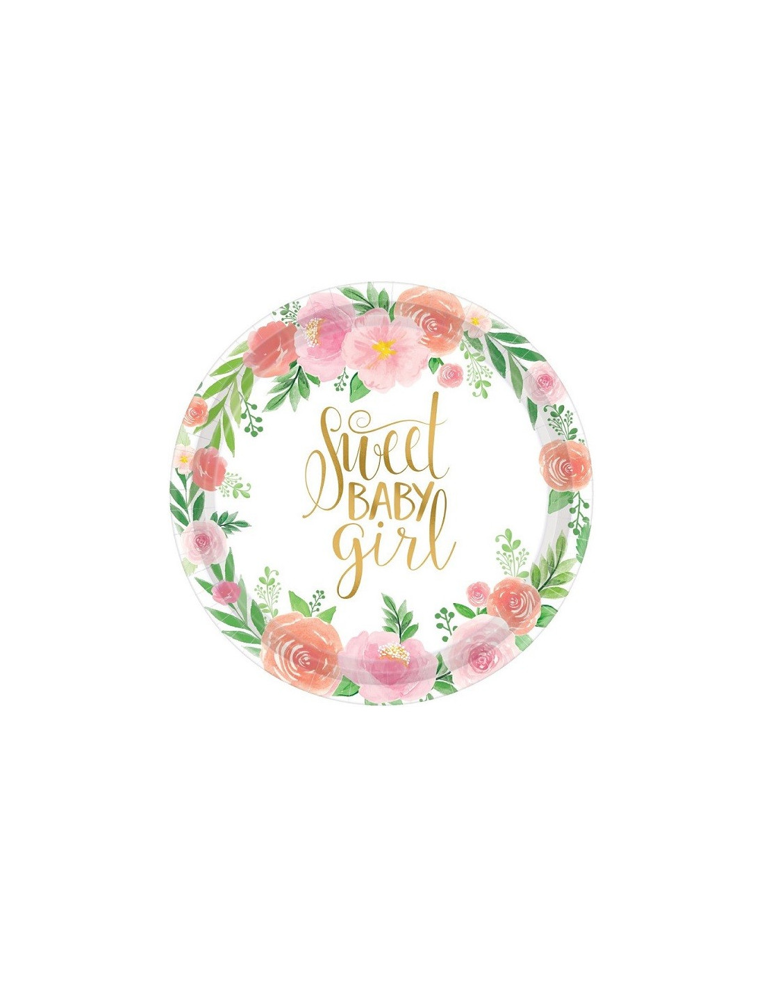 Bellissimi piatti con motivi floreali rosa vintage e scritta dorata "SWEET BABY GIRL". Ideali per decorare la tavola in occasione di un baby shower, un battesimo o per festeggiare l'arrivo di una dolce bambina.