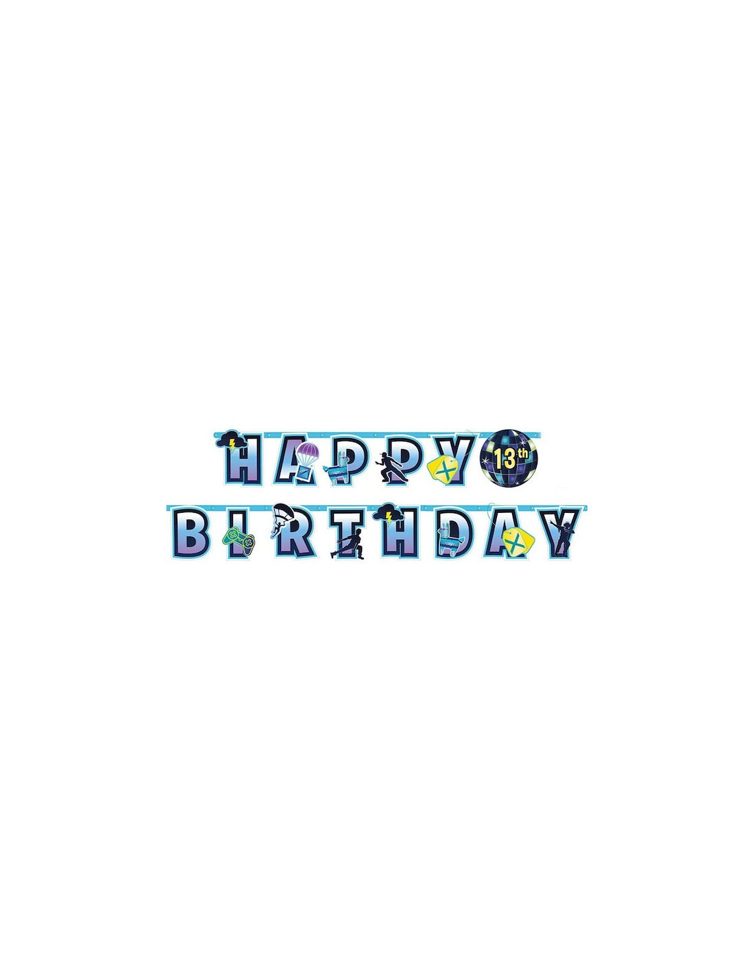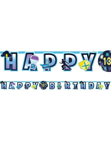 Questa ghirlanda è stampata con la scritta "Happy Birthday" e presenta diversi simboli del gioco Fortnite. Puoi personalizzarla con l'età desiderata.